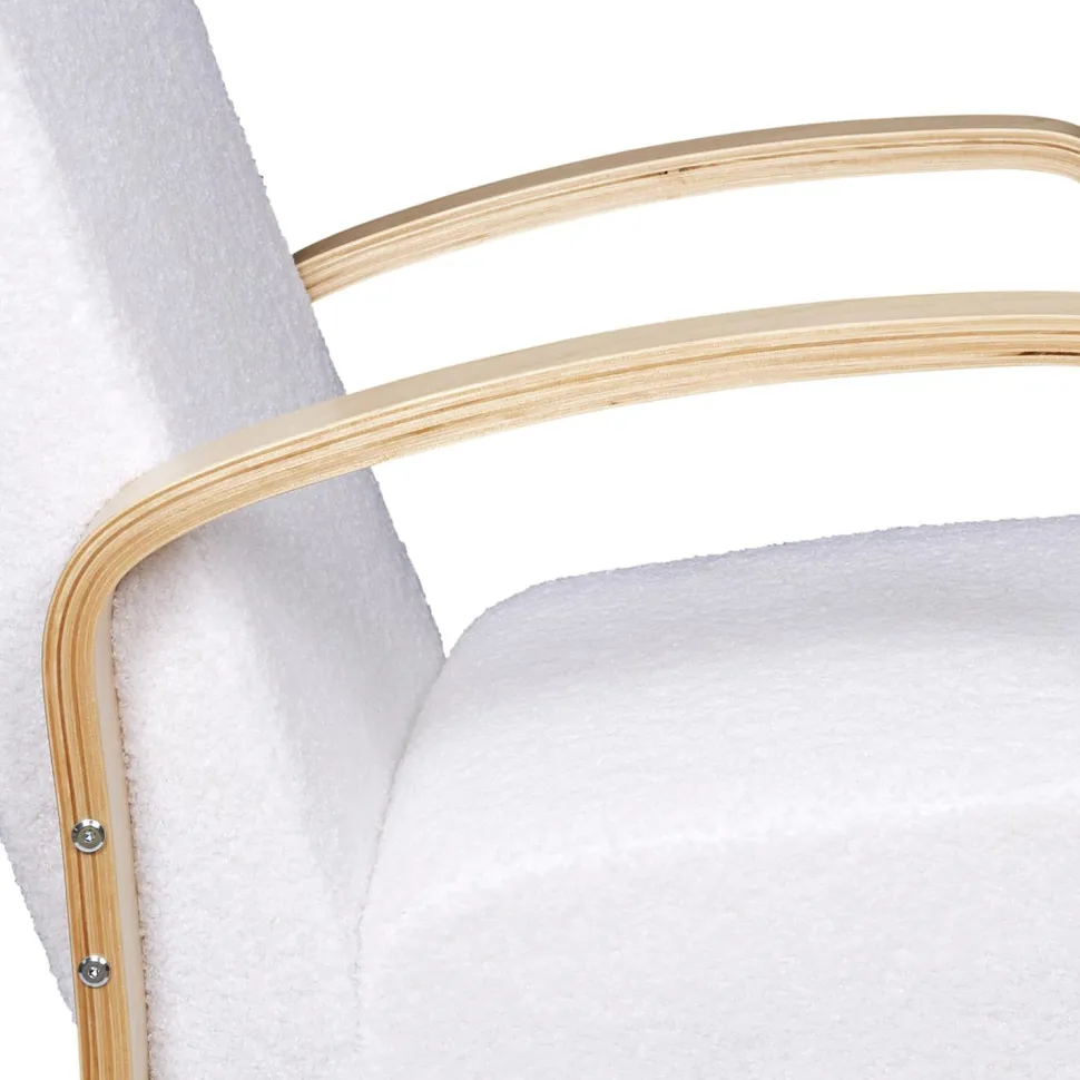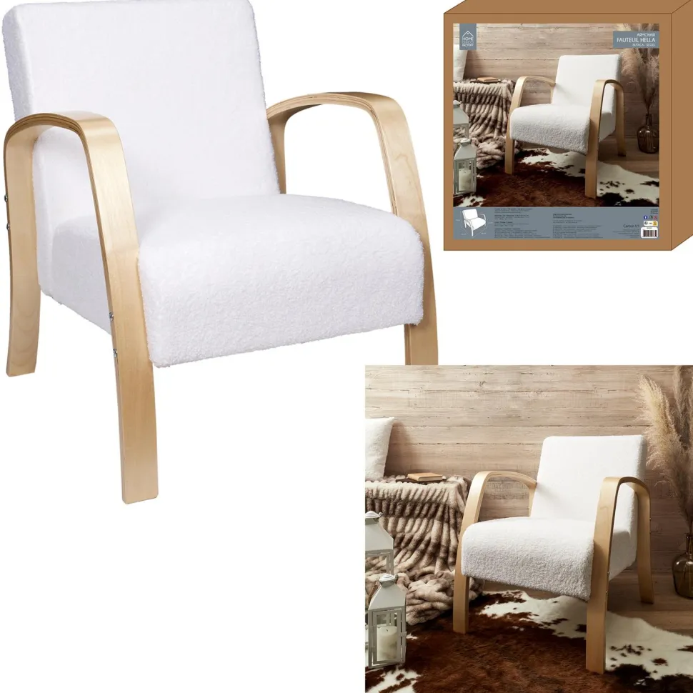 Fotel Hella boucle biały/ naturalny wykonany jest z drewna kauczukowego, tkaniny poliestrowej oraz pianki tapicerskiej. Tkanina boucle jest niezwykle przyjemna w dotyku i wykonana w 100% z poliestru. Fotel posiada podłokietniki, które są przedłużeniem nóżek. Maksymalne obciążenie fotela wynosi 120 kg, co gwarantuje jego trwałość i stabilność.