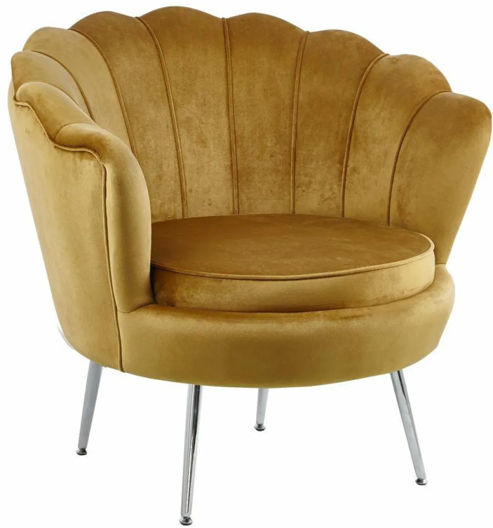 Fotel Korab VIC w kolorze musztardowym ze srebrnymi nogami topołączenie elegancji, wygody i stylu glamour,które doskonale sprawdzi się w każdym nowoczesnym wnętrzu. Jegodesignerska forma, inspirowana kształtem muszli,nadaje mu wyjątkowy charakter, który będzie ozdobą zarówno salonu, jak i sypialni.