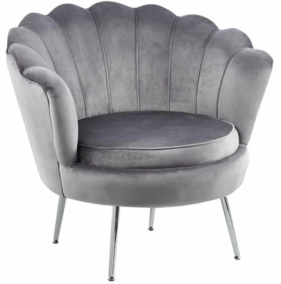 Fotel Korab VIC w kolorze szarym ze srebrnymi nogami to połączenie elegancji, wygody i stylu glamour, które doskonale sprawdzi się w każdym nowoczesnym wnętrzu. Jego designerska forma, inspirowana kształtem muszli, nadaje mu wyjątkowy charakter, który będzie ozdobą zarówno salonu, jak i sypialni.