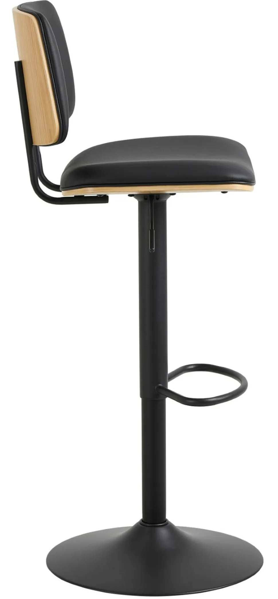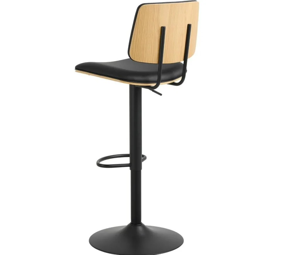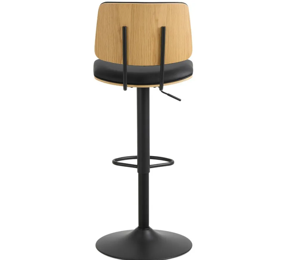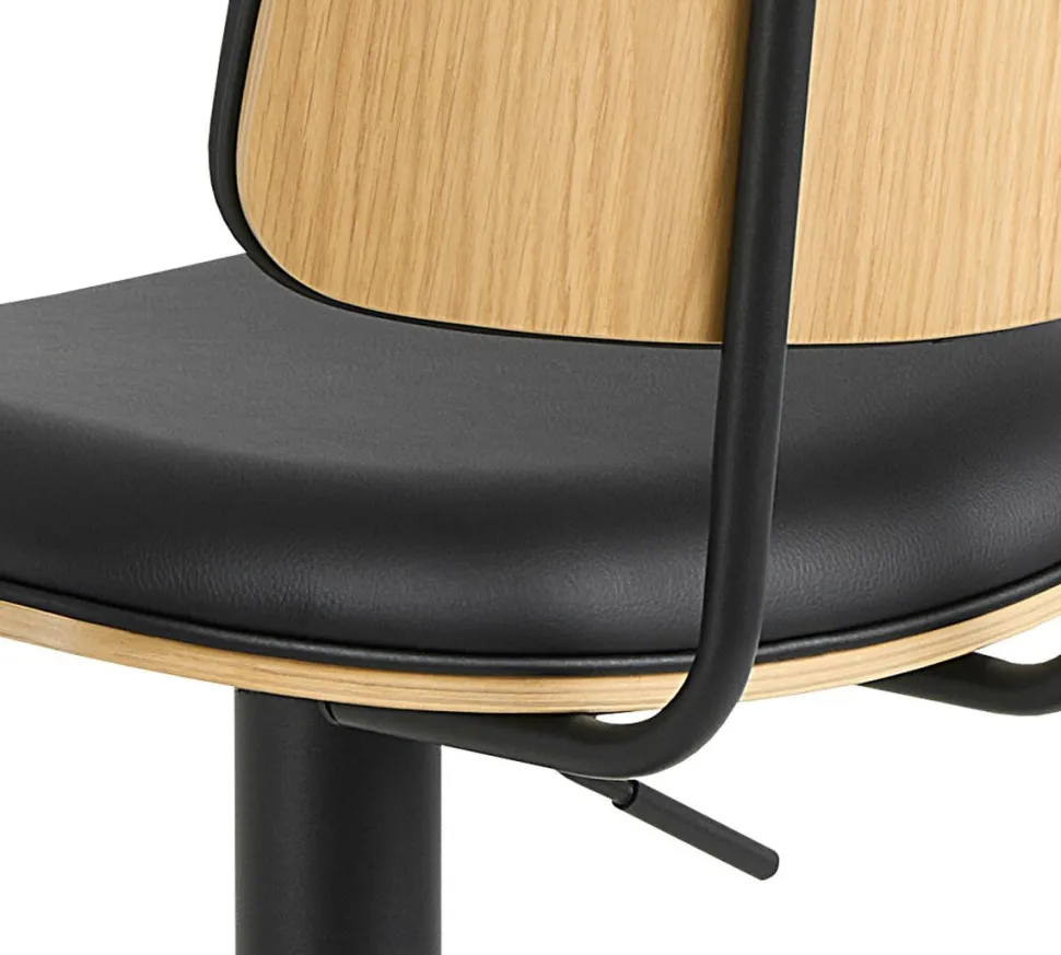 Hoker Owen to niezwykle stylowy i wygodny stołek barowy, który doskonale wpisuje się w trendi nowoczesne, industrialne i skandynawskie aranżacje. Dzięki regulowanej wysokości i funkcji obrotowej, stołek ten umożliwia łatwe przemieszczanie się i dostosowanie do indywidualnych preferencji. Dwa połączone czarne rurki tworzą stabilną podstawę, na której umieszczono siedzisko z giętego forniru dębowego. Ciepły odcień drewna idealnie kontrastuje z czarną sztuczną skórą, dodając całości wyrazistego charakteru.