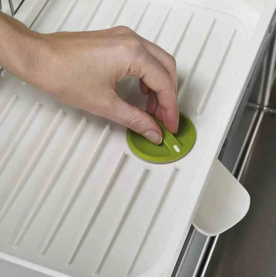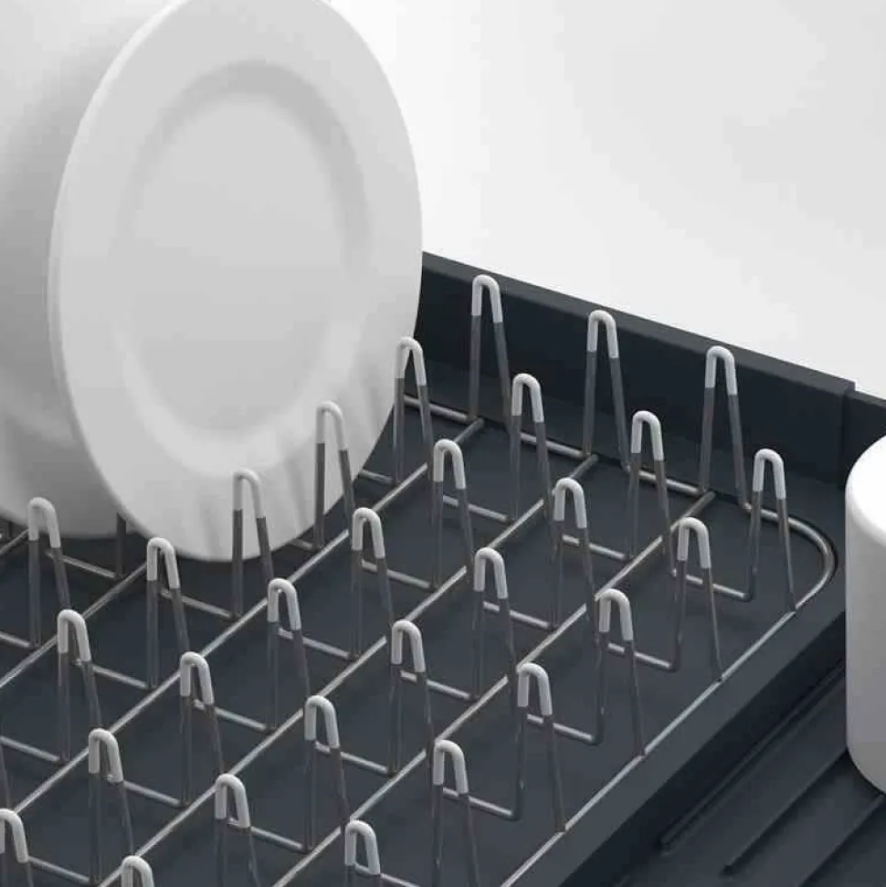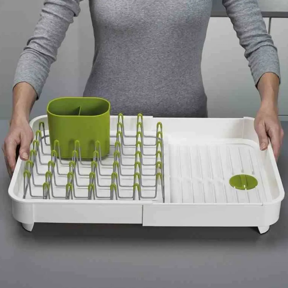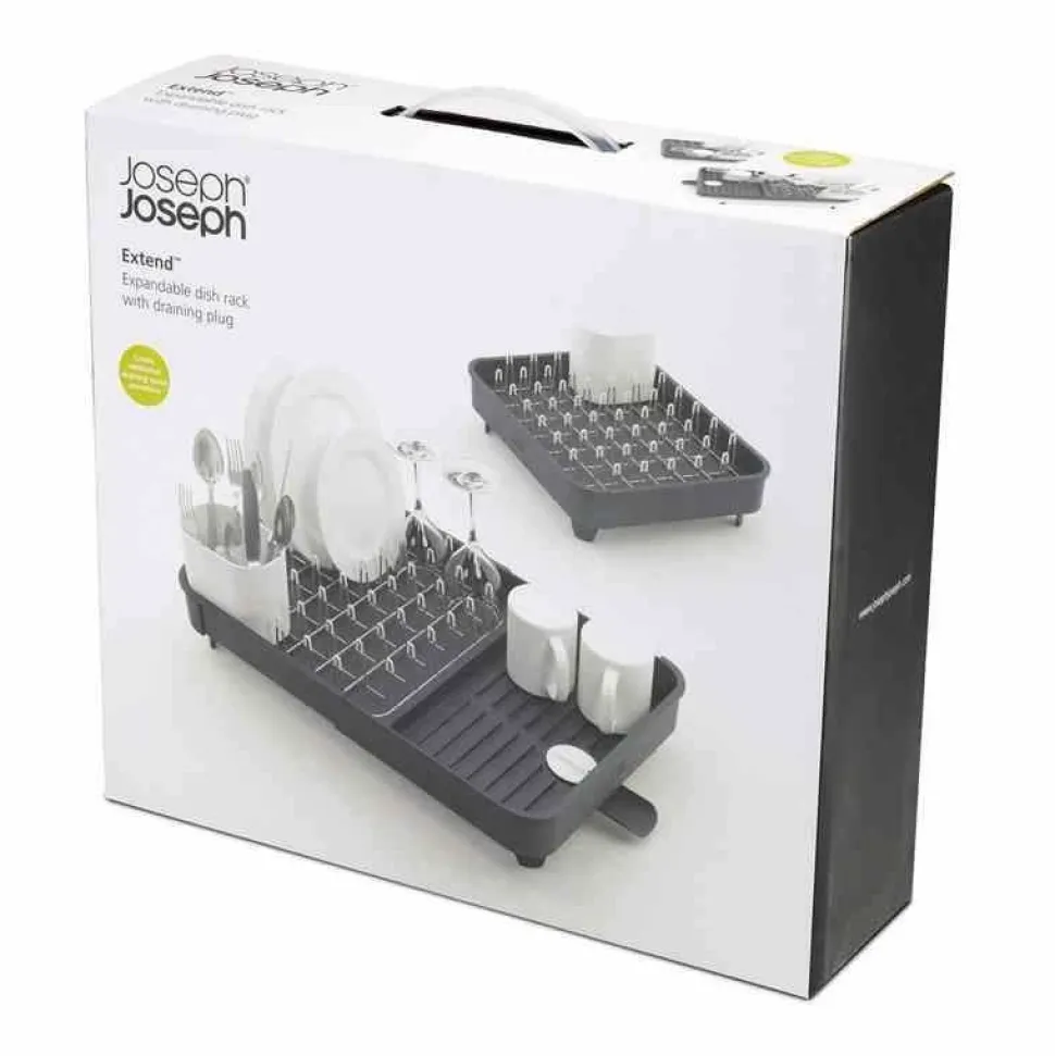 Nowa suszarka Extend, którą z łatwością można powiększyć, gdy tego potrzebujesz. Zaletą suszarki jest możliwość zamykania i otwierania otworu odprowadzającego wodę. Woda może być odprowadzona bezpośrednio do zlewu przy pomocy lejka, bądź zatrzymana w suszarce, co pozwala na suszenie naczyń na blacie z dala od zlewu. Niklowane stalowe pręty pokryte warstwą tworzywa, które nie rysuje powierzchni naczyń. Wkład można wyciągać dla łatwiejszego czyszczenia suszarki. Suszarka posiada żeberka do suszenia miseczek czy kubków, dzięki którym woda nie zalega pod naczyniami. Pojemnik do suszenia sztućców może być wyciągany i umieszczony w dowolnym miejscu. Antypoślizgowe nóżki