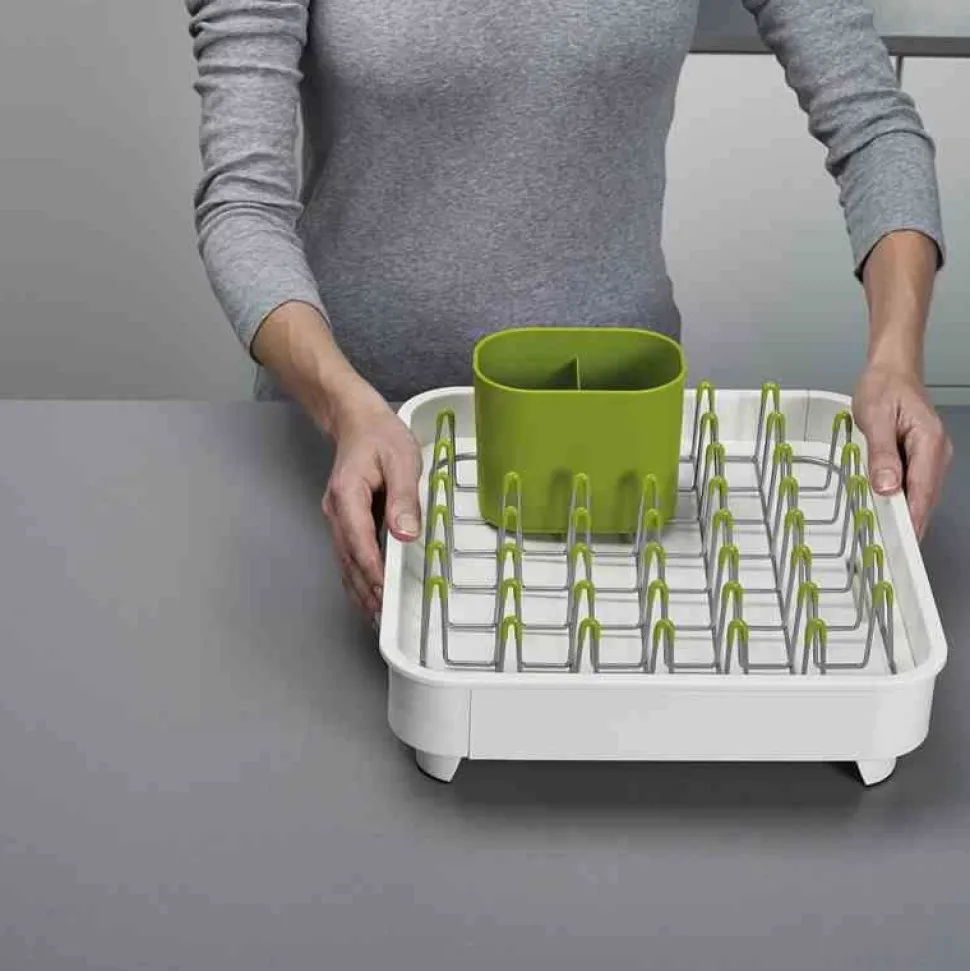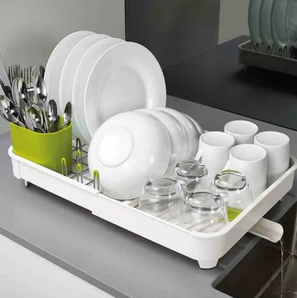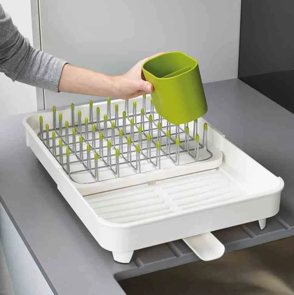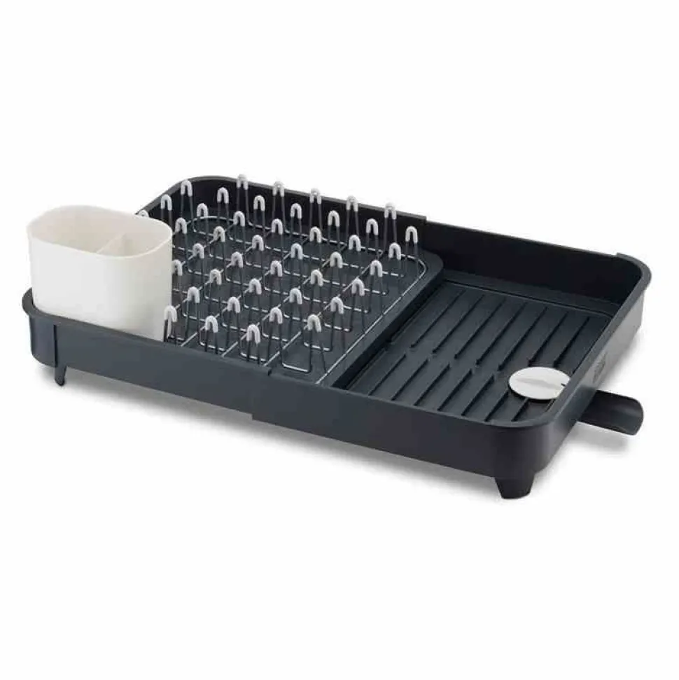 Nowa suszarka Extend, którą z łatwością można powiększyć, gdy tego potrzebujesz. Zaletą suszarki jest możliwość zamykania i otwierania otworu odprowadzającego wodę. Woda może być odprowadzona bezpośrednio do zlewu przy pomocy lejka, bądź zatrzymana w suszarce, co pozwala na suszenie naczyń na blacie z dala od zlewu. Niklowane stalowe pręty pokryte warstwą tworzywa, które nie rysuje powierzchni naczyń. Wkład można wyciągać dla łatwiejszego czyszczenia suszarki. Suszarka posiada żeberka do suszenia miseczek czy kubków, dzięki którym woda nie zalega pod naczyniami. Pojemnik do suszenia sztućców może być wyciągany i umieszczony w dowolnym miejscu. Antypoślizgowe nóżki