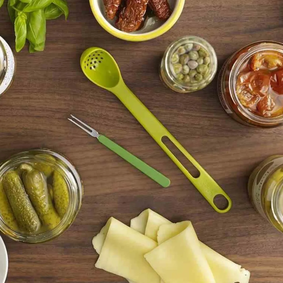 Łyżeczka z widelczykiem idealna do wyciągania produktów ze słoika. Łyżka posiada otworki dzięki czemu sprawdzi się w trakcie wyjmowania oliwek czy pieczarek z zalewy. Dodatkowo w łyżeczce z tyłu znajduje się wyjmowany widelczyk np. do nabijanie ogórków przy wyciąganiu ze słoika. Łyżka idealne do wyciągania produktów z wysokich słoików. Wymiary: 3 x 20 x 2,8 cm Kolor: zielony Materiał: tworzywo sztuczne