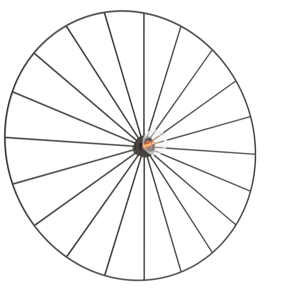 PlafonSirkel o średnicy 60cm to metalowy abażur budową przypominający koło od wozu. Okrągły, płaski abażur z cienkimi czarnymi przęsłami wykonany został z metalu malowanego proszkowo na czarno.