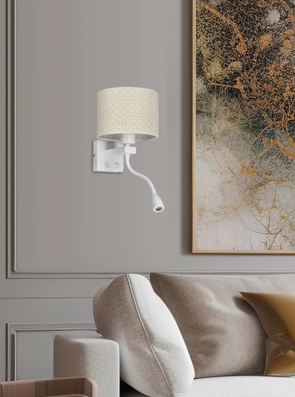 Prezentowany kinkiet Polo to połączenie nowoczesności i glamour w jednym. Wyposażony w oprawę żarówki E27, oferuje moc oświetlenia na poziomie 40W z dodatkowym 2W światła LED. Jego biały kolor doskonale komponuje się z kremowym abażurem wykonanym z tkaniny, co nadaje mu eleganckiego i stylowego wyglądu. Oświetlenie LED zapewnia nie tylko funkcjonalność, ale również oszczędność energii.