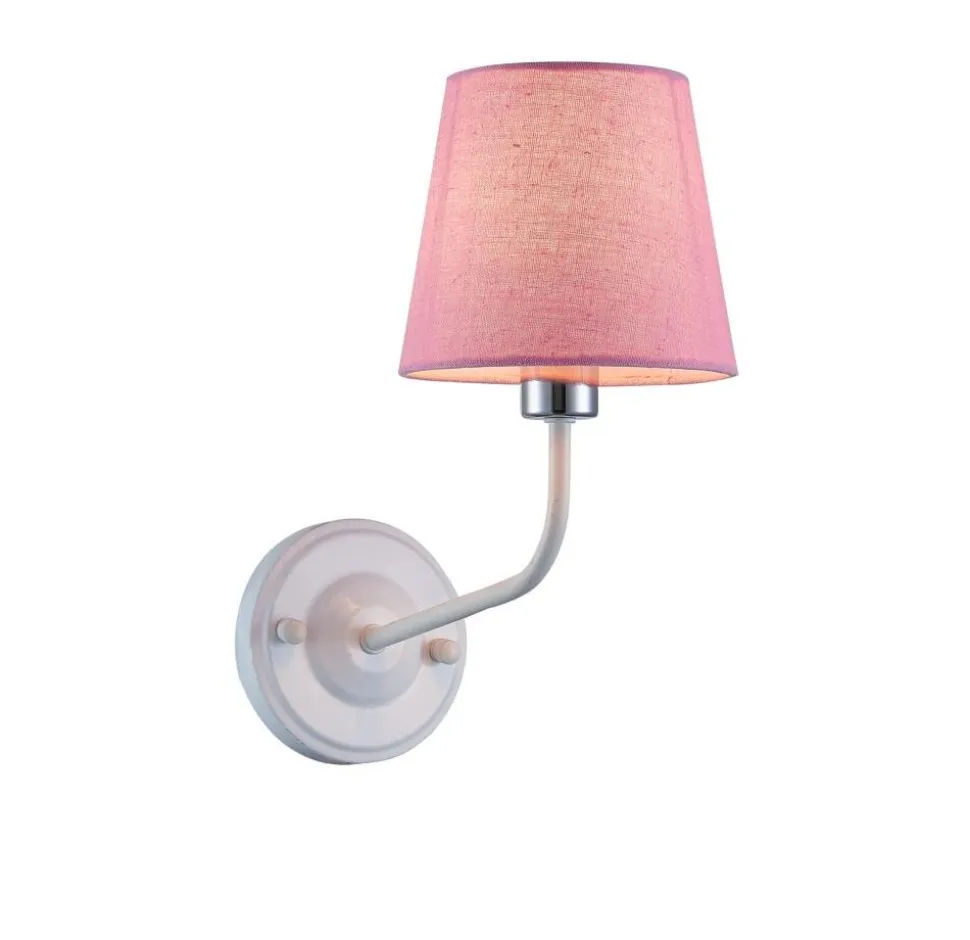Seria lamp klasycznych wykonanych z metalu malowanego na biało z kolorowymi kloszami. W skład rodziny wchodzą dwa żyrandole, kinkiet i lampa stołowa. Rodzina występuje w trzech wariantach kolorystycznych kloszy: białym, niebieskiem i różowym. Seria doskonale nadaje się do pomieszczeń takich jak: salon, jadalnia, sypialnia, pokój dziecięcy i pokój dziewczęcy. Będzie również doskonałym elementem dekoracyjnym pomieszczeń użyteczności publicznej typu salony piękności, gabinety biurowe itp. Kinkiet z rózowym kloszem i jednym punktem świetlnym. Żarówka nie jest dołączona do produktów z zewnętrznym źródłem światła.