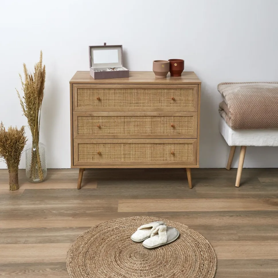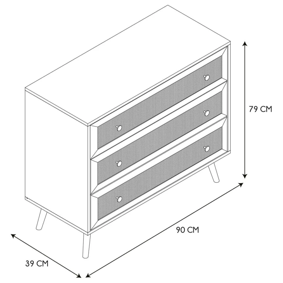 Komoda Bali z trzema szufladami to mebel z plecionymi frontami w stylu boho. Podstawą komody są cztery nogi, które dzięki swojej budowie gwarantują stabilizację. Komoda Bali będzie najpiękniejszym meblem w Twoim wnętrzu, trzy pojemne szuflady pomogą uporządkować bieliznę, drobnostki lub sztućce. Nieograniczone możliwości komody pozwalają aby była ona meblem nie tylko sypialni ale również salonu w stylu boho lub nawet biura. – Główny skład: sklejka. Mebel wymaga samodzielnego montażu.Wymiary opakowania: 42 x 15 x 94 cmCechy produktu:- Uszkodzenie poszczególnych elementów komody.