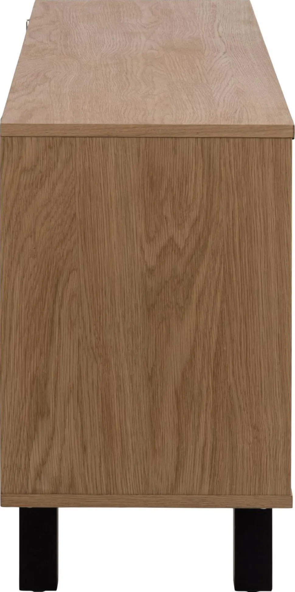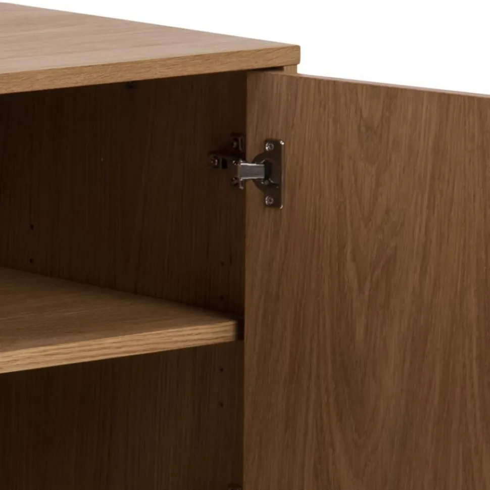 Komoda Brighton to piękne, doceniane na całym świecie skandynawskie wzornictwo. Mebel został wykonany metalu i płyty meblowej, dzięki czemu jego ogólny charakter sprawia, że prezentuje się niezwykle lekko i efektownie. Olejowane fronty komody z płyty meblowej pokryte zostały paskami z forniru dębowego ułożonymi w modny wzór jodełki. Taki szczegół z pewnością przyciągnie uwagę nawet najbardziej wymagających. Korpus komody to również płyta meblowa pokryta fornirem dębowym o nienagannej strukturze i gładkim wykończeniu. Podstawą komody są cztery lekko pochylone nogi wykonane z metalu pomalowanego na czarno. Metalowe uchwyty ułatwiają otwarcie szafek. Komoda posiada dwie szafki, które skrywają pojemne półki.