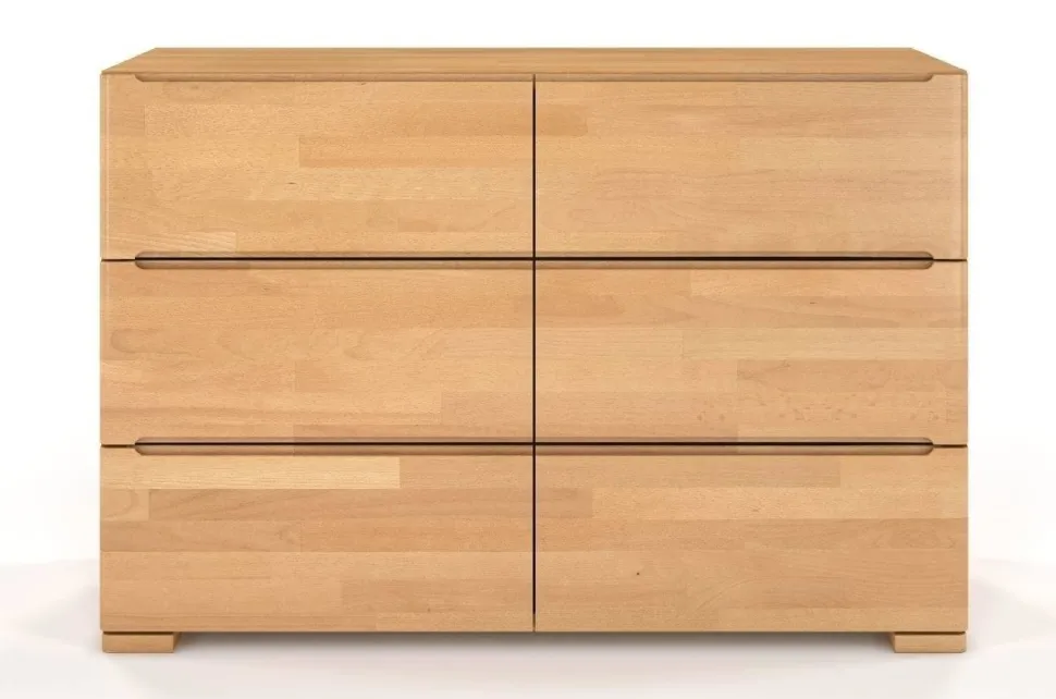 Komoda SPARTA wspiera się na subtelnych, ale niezwykle mocnych nogach, które dbają o jej stabilność. Narożniki nóg i boczne krawędzie komody zostały zaokrąglone, dodając opływowego kształtu i lekkości, jednocześnie podnosząc bezpieczeństwo mebla. Aby pogodzić wizualną skromność modelu i użytkową potrzebę wygody, uchwyty to frezowane wycięcia w krawędziach szuflad.Materiał: lite drewno bukoweWykończenie drewna: bejca + ekologiczny lakier wodnyDno szuflady: płyta HDF (standardowa płyta wykorzystywana do wykonywania dna szuflad w meblach)Prowadnice w szufladach: z systemem cichego domyku i hamulcem – szuflada zwalnia podczas zamykania, domykając się cichoUchwyty w szufladach: brak; wycięcia w krawędziach szufladŁączenie elementów mebla: śruby; metalowe okucia