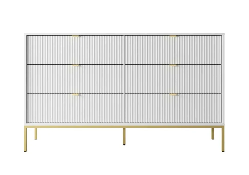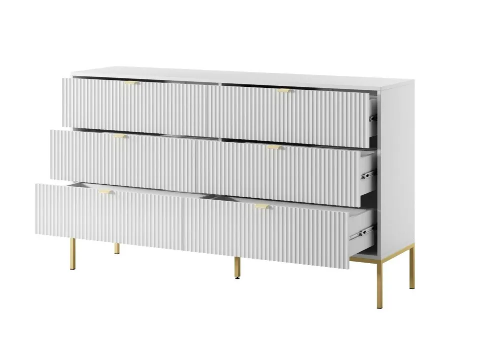 - Połączenie ryflowanych frontów w eleganckiej bieli i złotych uchwytów nadaje komodzie nowoczesny i luksusowy charakter