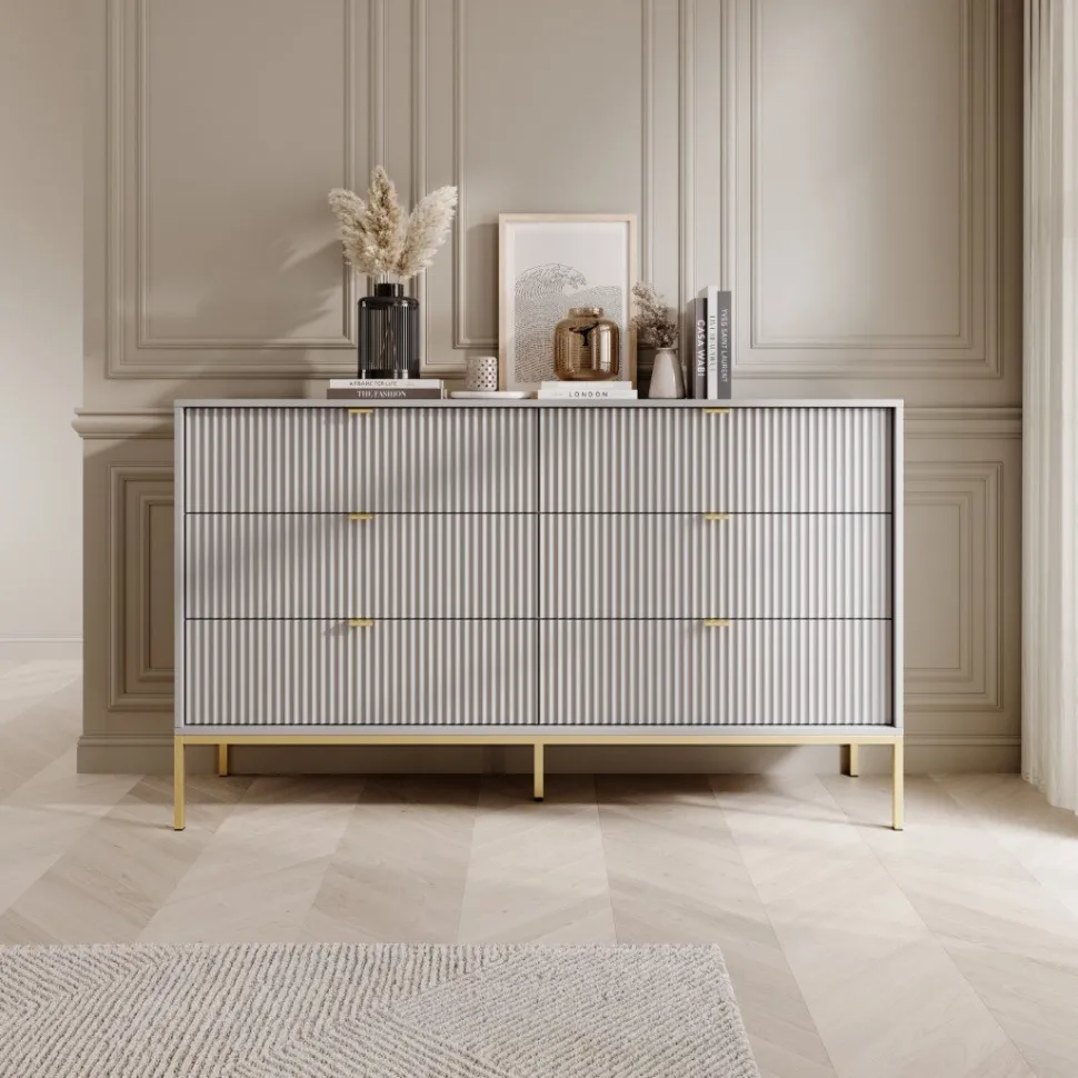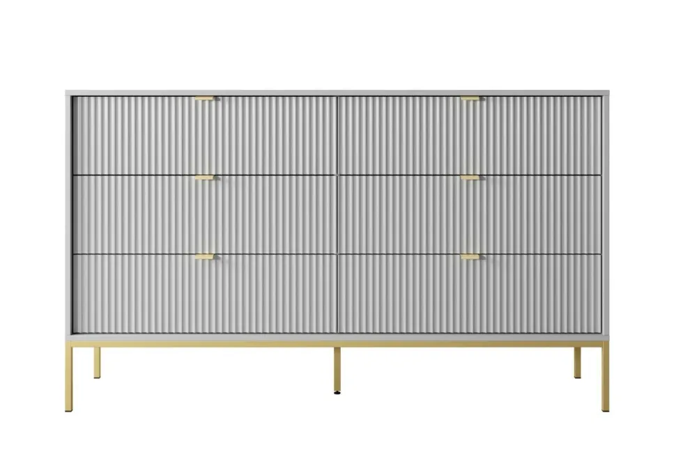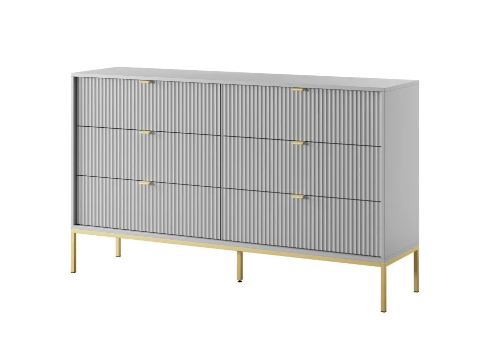 Komoda Delicious 6 szuflad ryflowana szara z złotymi nogami to doskonały wybór dla osób ceniących nowoczesny design i funkcjonalność. Jej fronty w eleganckim odcieniu szarości, ozdobione subtelnymi ryflowaniami, tworzą elegancki i stylowy wygląd, który wprowadza do wnętrza odrobinę luksusu. Złote aluminiowe uchwyty dodają całości nowoczesnego charakteru i świetnie kontrastują z szarym wykończeniem, podkreślając wyjątkowy styl komody.