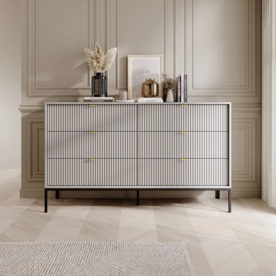 Komoda Delicious 6 szuflad ryflowana szara to mebel, który wprowadza do wnętrza nowoczesny styl i wyjątkowy urok. Jej ryflowane fronty nadają jej charakteru i elegancji, a złote, aluminiowe uchwyty dodają luksusowego akcentu. Szary kolor komody sprawia, że jest to uniwersalny element dekoracyjny, który pasuje do różnych aranżacji wnętrz, wnosząc do nich nutę wyrafinowania.