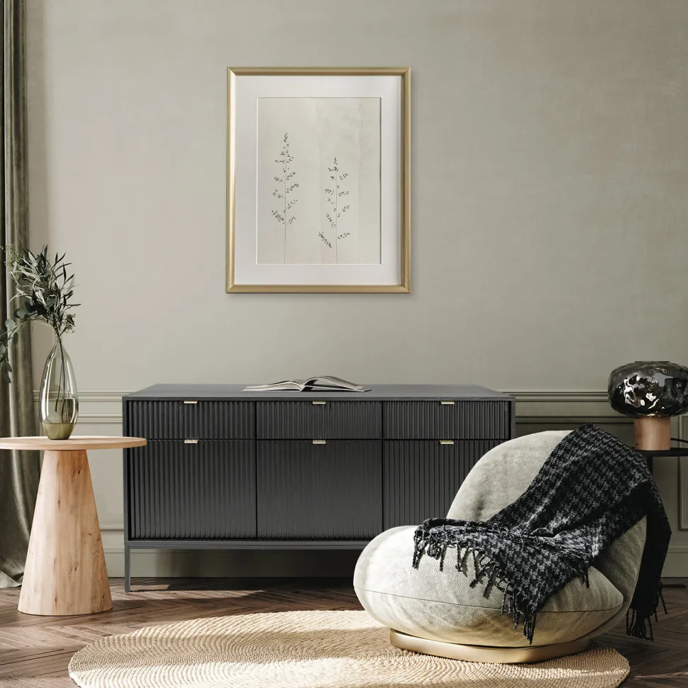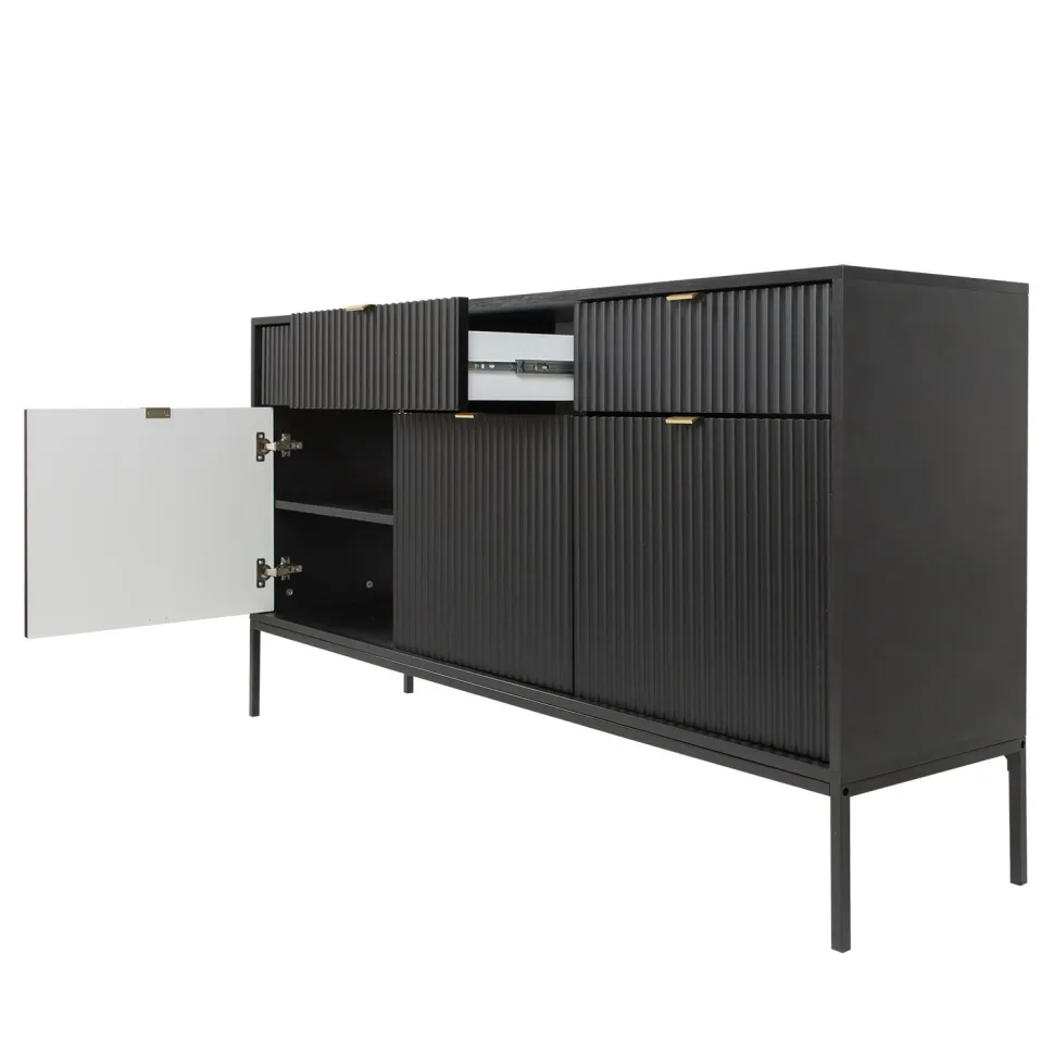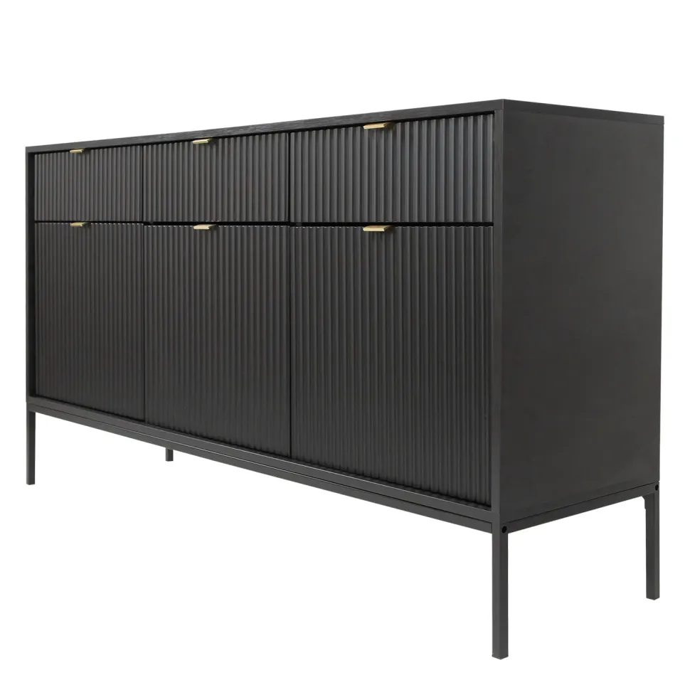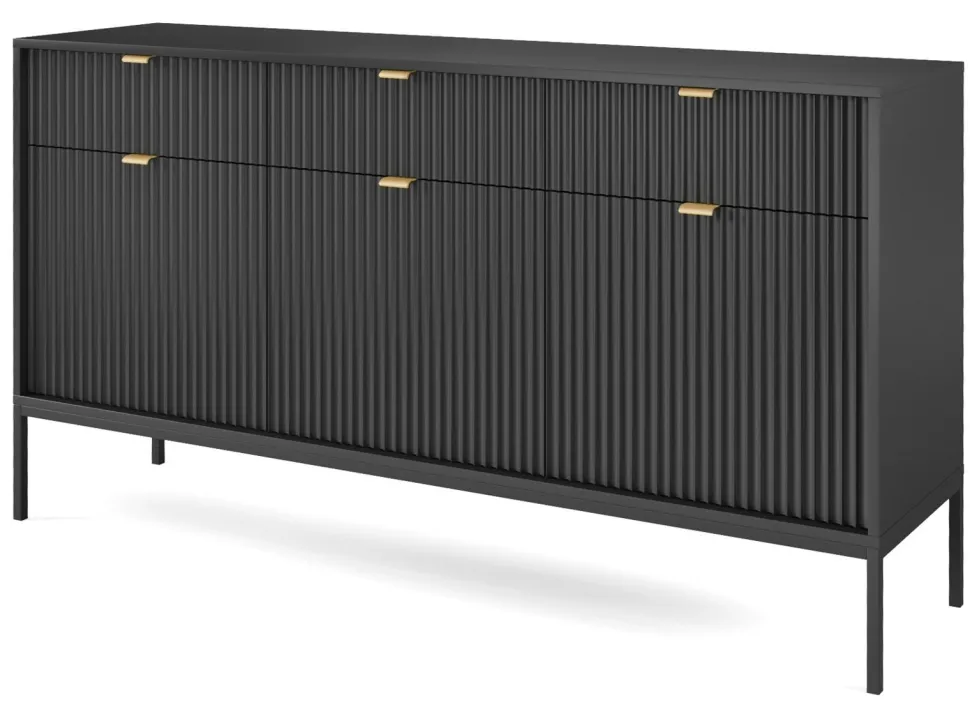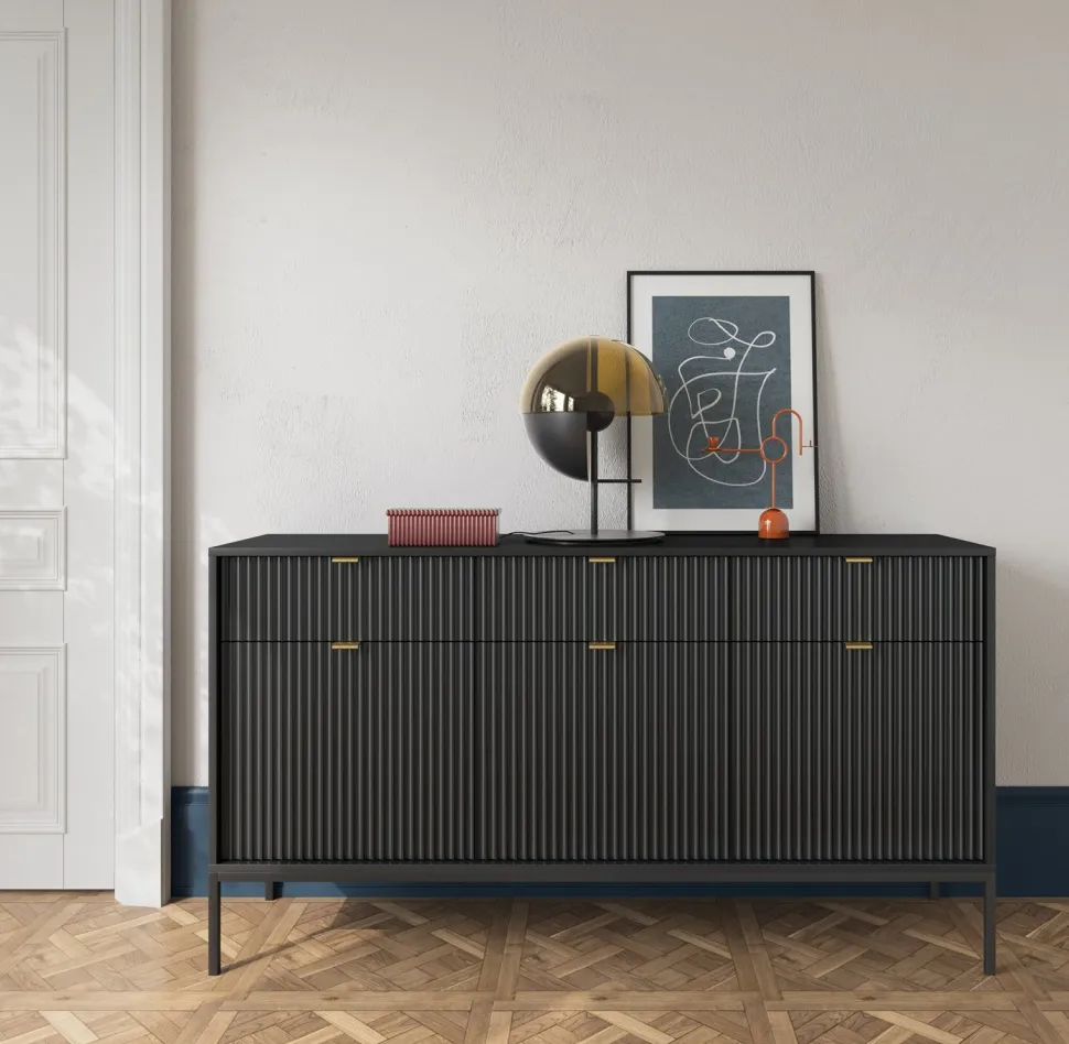 Komoda Delicious duża ryflowana czarna marki Intesi będzie nie tylko wygodnym elementem wyposażenia, ale też perfekcyjnie ozdobi Twoją przestrzeń. Trwała i całkiem spora komoda w czarnym kolorze została wykonana z aluminium, metalu i meblowej płyty. Dzięki temu, że komodę zrobiono z z aluminium, meblowej płyty i metalu, jest ona uniwersalna, solidna i optycznie podkreśla styl pomieszczenia, ale liczymy na to, że samodzielnie przekonasz się też o innych zaletach tych surowców. Nowoczesnego i minimalistycznego wyglądu całości komody delikatne zdobienie, jakim są metalowe uchwyty.