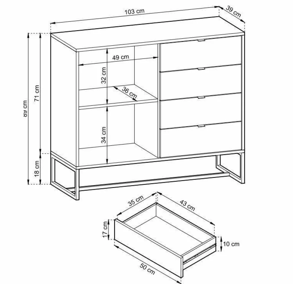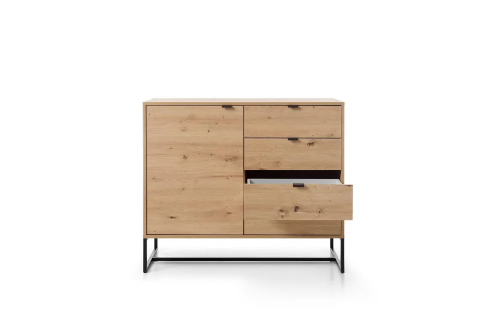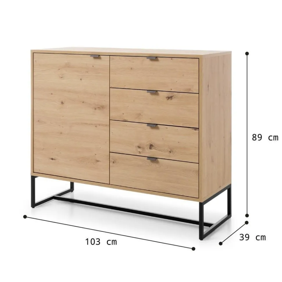 Komoda Dori to nowoczesny mebel inspirowany klimatem industrialnym. Wykonana została z lekkiej, trwałej płyty MDF w okleinie dębu. Komoda składa się z czterech szuflad i szafek, które pozwalają na przechowywanie ubrań, bielizny czy dokumentów. Zastosowane kontrastowe kolory – odcienie dębu oraz czarny metal – dodają jej efektowności i sprawiają, że komoda prezentuje się bardzo stylowo. Nowoczesne nogi komody tworzą subtelną konstrukcję, która sprawdzi się w każdym wnętrzu.