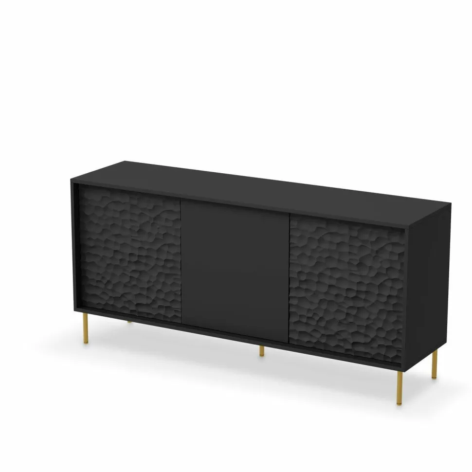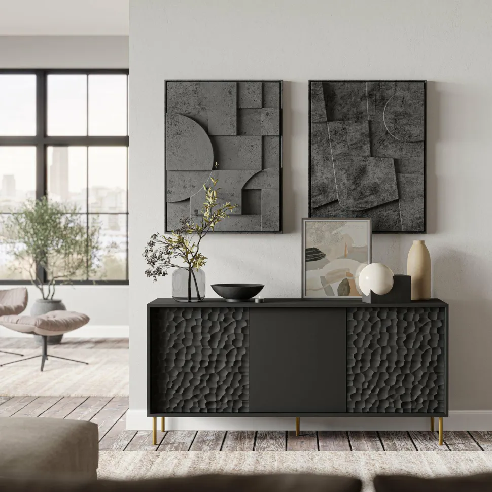 Jej czarny kolor doskonale komponuje się z różnymi stylami wnętrzarskimi, od nowoczesnych po klasyczne, dzięki czemu możesz ją swobodnie wkomponować w istniejącą aranżację. Największym atutem tej komody jest jej elegancki design. Dekoracyjne fronty z dekorem 3D w formie wgłębień nadają meblowi wyjątkowego charakteru, a złote detale w postaci cienkich nóżek dodają mu dodatkowego uroku. Dzięki temu komoda z kolekcji Afir staje się nie tylko praktycznym meblem do przechowywania, ale również ozdobą, która przyciąga wzrok i dodaje wnętrzu wyjątkowego stylu.