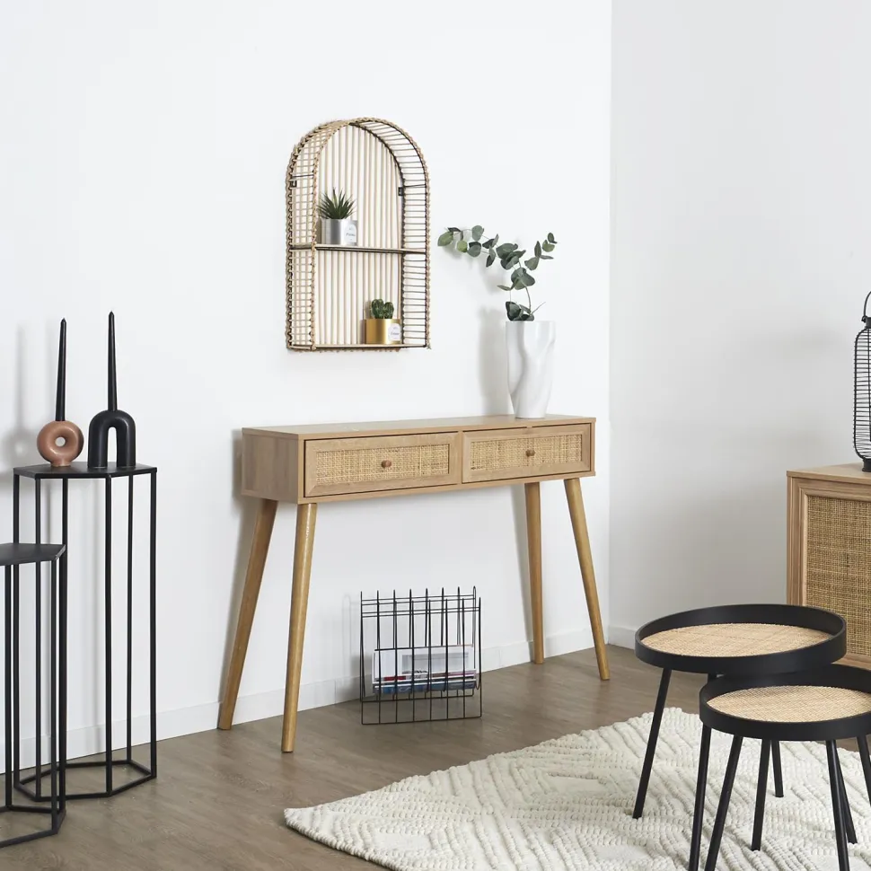 Konsola Bali to jeden z kilku elementów egzotycznej kolekcji Bali. Jest to wyjątkowy mebel, łączący w sobie najwyższą jakość z eleganckim designem w naturalnym stylu. Mebel to świetny pomysł na ocieplenie wnętrza. Jasne fronty, drewniane wykończenie przywodzi na myśl naturę i harmonię. Bali swoim designem nawiązuje do mebli, jakie możemy spotkać podczas luksusowych wakacji w takich miejscach jak Dominikana czy Malediwy. Kolekcja charakteryzuje się naturalnymi rattanowymi frontami, nogami z litego drewna eukaliptusa oraz wytrzymałymi blatami z płyty meblowej. Korpus konsoli dzięki konstrukcji z płyty meblowej jest w stanie utrzymać ciężki wazon lub lustro. Maksymalne obciążenie to aż 30kg. Konsola wyposażona została w dwie szuflady, których zwieńczeniem są drewniane uchwyty. Bali będzie najpiękniejszym meblem w Twoim wnętrzu.