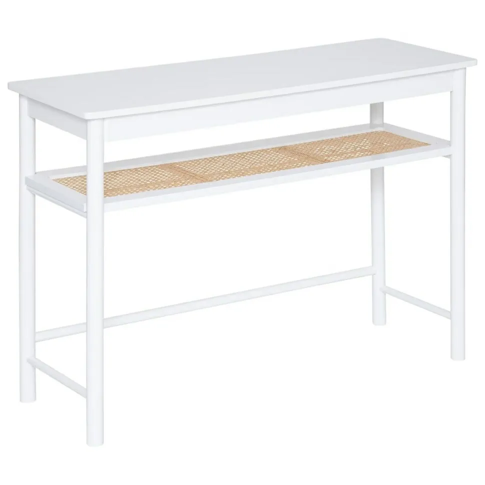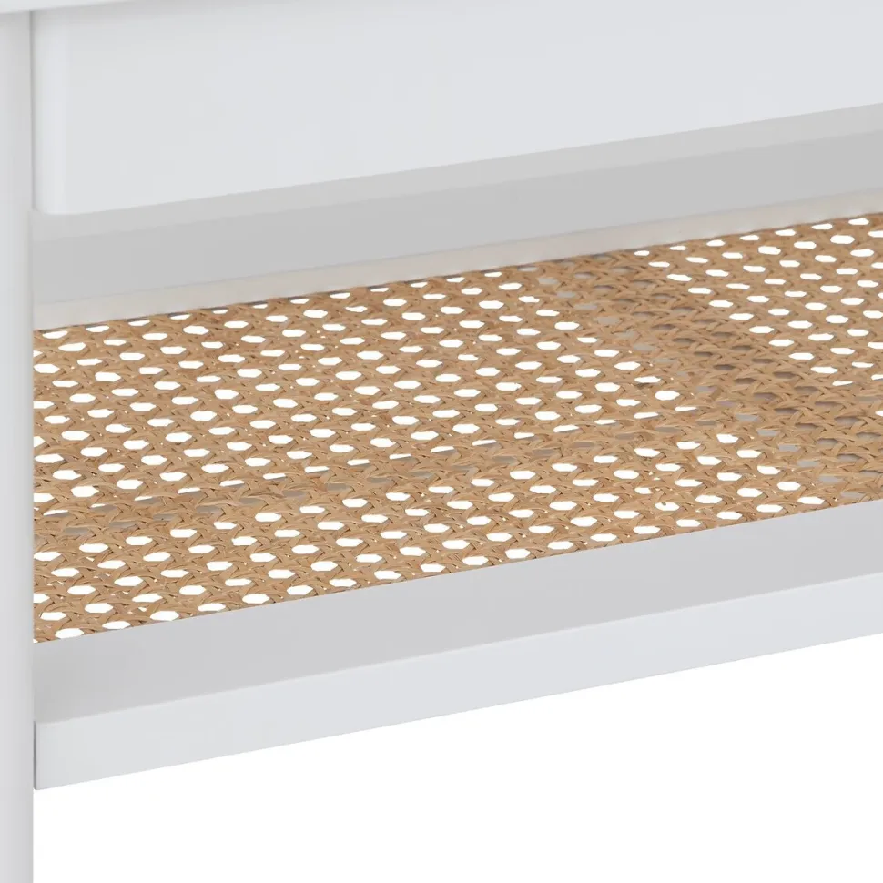 Jeżeli pragniesz połączyć nowoczesny design z praktycznym rozwiązaniem do przechowywania, konsola Cabras będzie idealnym wyborem. Ten wyjątkowy mebel charakteryzuje się prostymi, ale eleganckimi liniami oraz stonowaną kolorystyką. Wykonany z wysokiej jakości płyty pilśniowej, pokrytej białą okładziną, idealnie wpasuje się w każde wnętrze. Dodatkowo, dolna półka z rattanowym obiciem dodaje mu niepowtarzalnego charakteru. Dzięki kompaktowym wymiarom, konsola Cabras doskonale sprawdzi się w przedpokoju czy korytarzu, tworząc przy tym wyjątkową atmosferę.