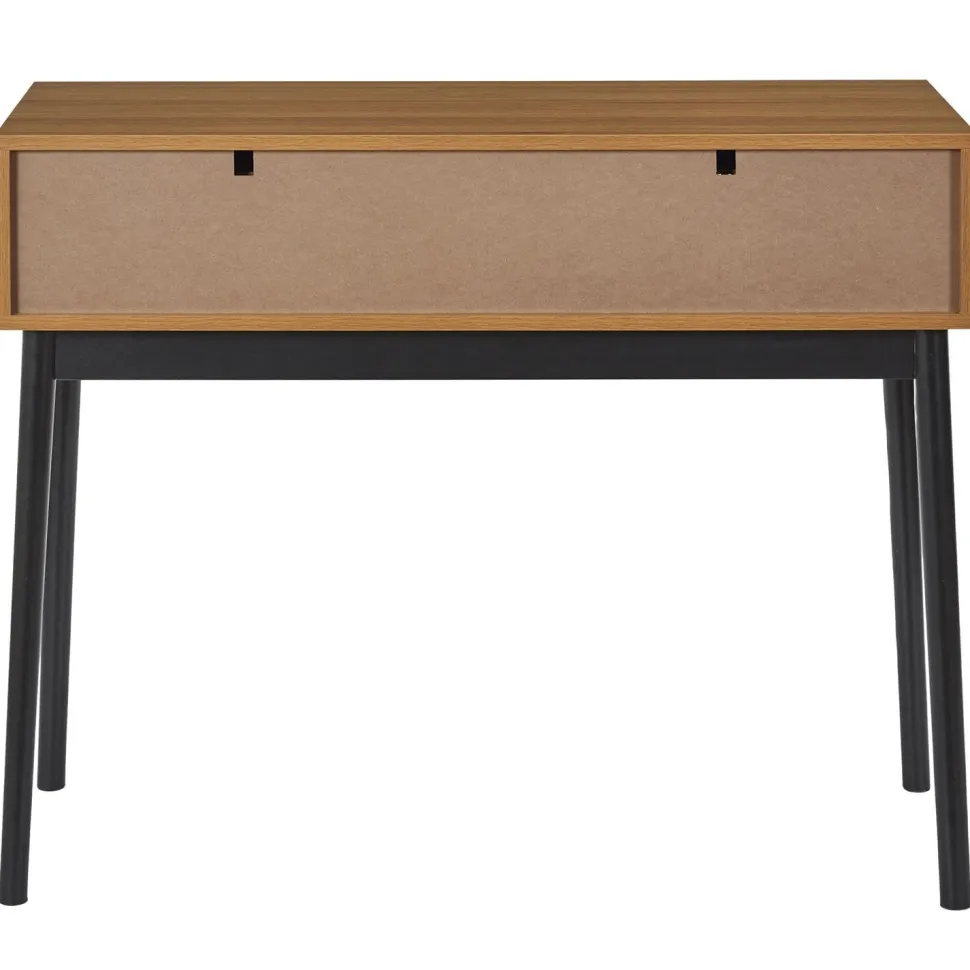 Wyjątkowy design konsoli Felix sprawia, że jest to mebel, który wprowadzi do Twojego domu nutę elegancji i stylu. Jego unikalny wzór na froncie w formie jodełki dodaje mu charakteru, a czarne nogi wykonane z drewna sosnowego wprowadzają kontrast, który podkreśla indywidualność tego mebla. Konsola jest nie tylko estetycznie wykonana, ale także praktyczna – wyposażona jest w dwie szuflady na szynach kulkowych, które pomogą Ci utrzymać porządek w domu.