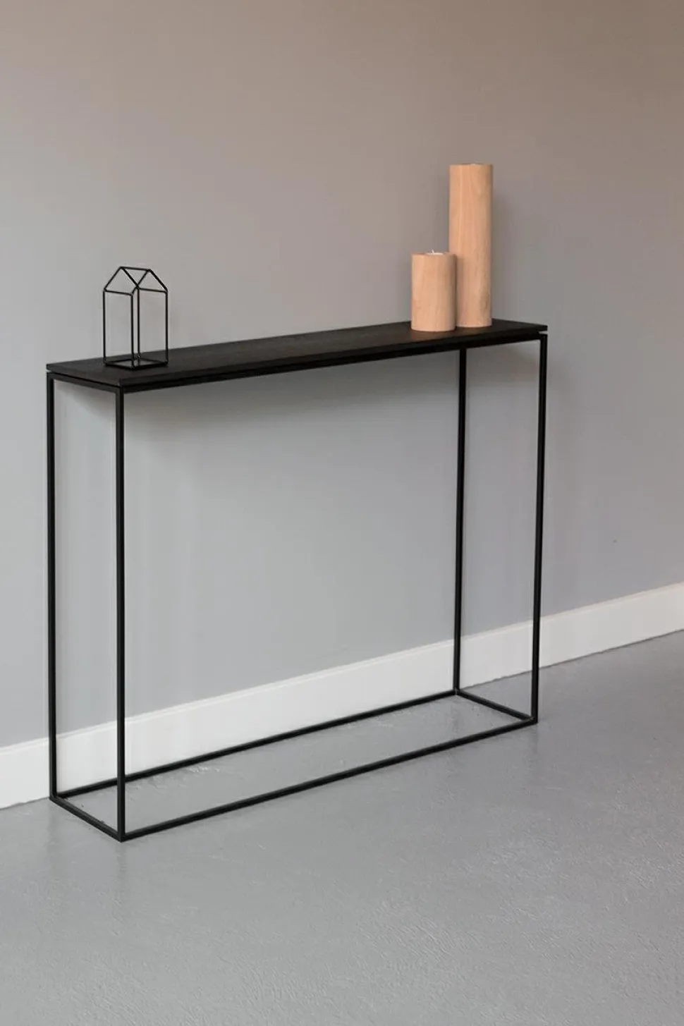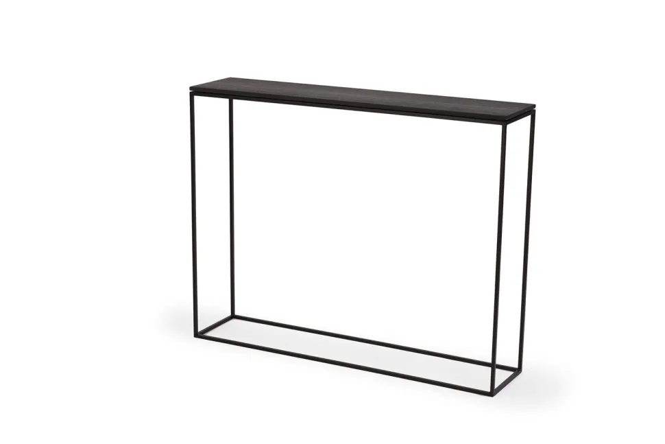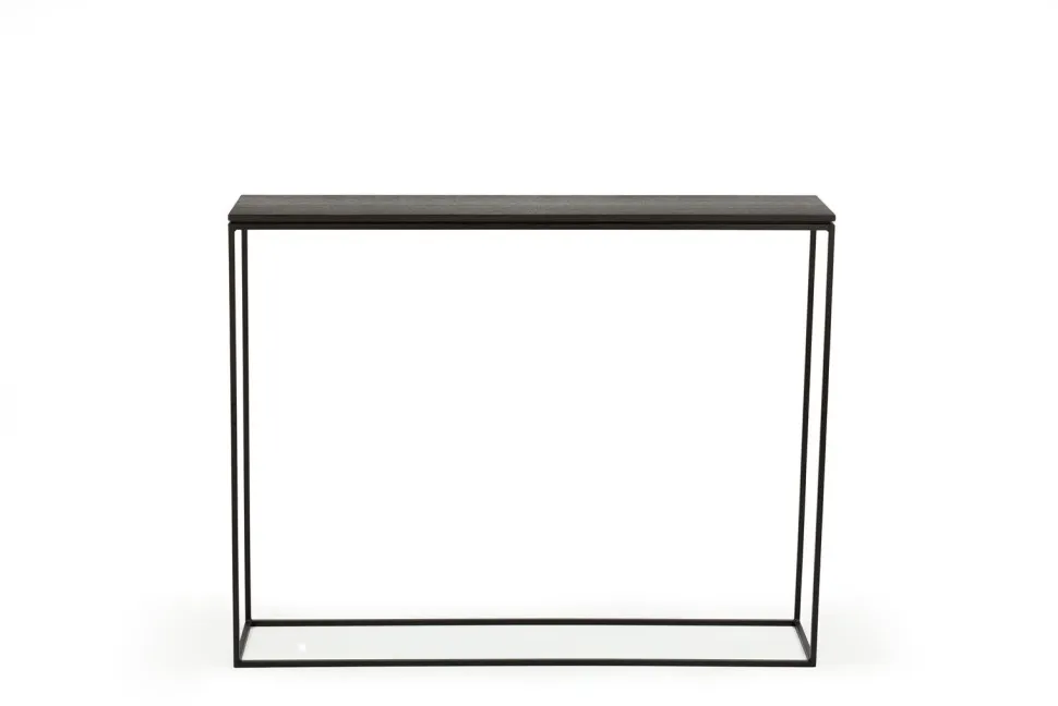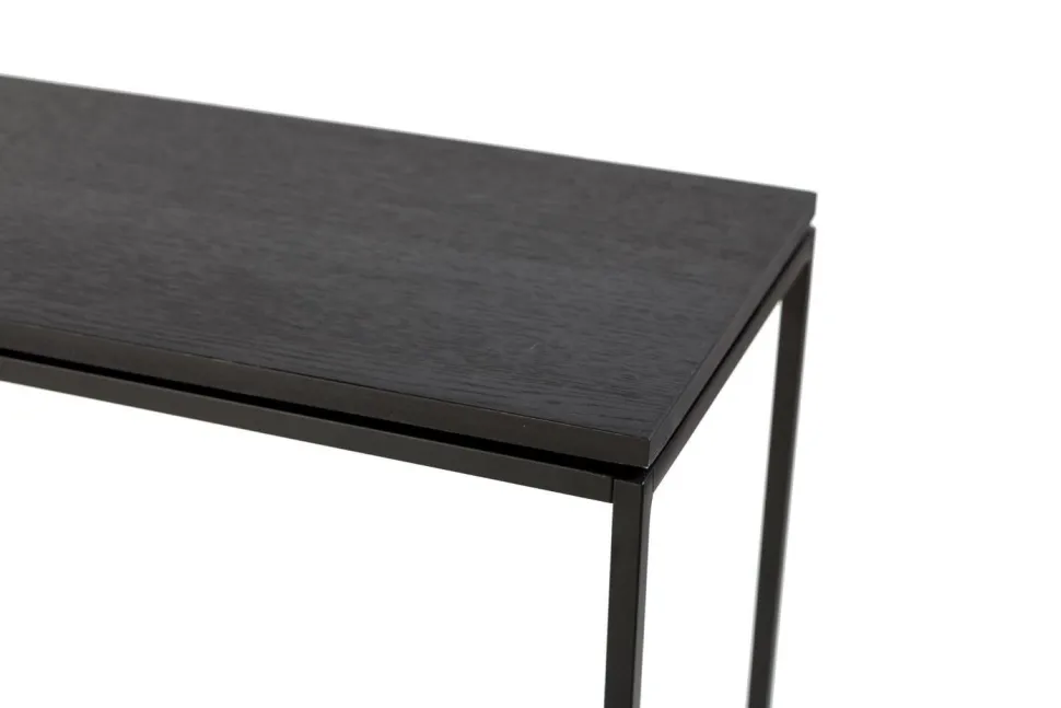 Meble projektowane ze szlachetnych materiałów, w klasycznym czarnym kolorze to kwintesencja New Nordic. Blat konsoli STAM 200 wykonany jest z dębu barwionego na czarno, rama polakierowana została czarnym, matowym lakierem i nie jest to minimalizm. Tak rozumiemy elegancję i prostotę. WYMIARY: Wysokość: 78 cm Głębokość: 22 cm Szerokość: 100cm MATERIAŁ: Metal, malowany proszkowo. Naturalny fornir dębowy bejcowany i olejowany. Waga: 9,5