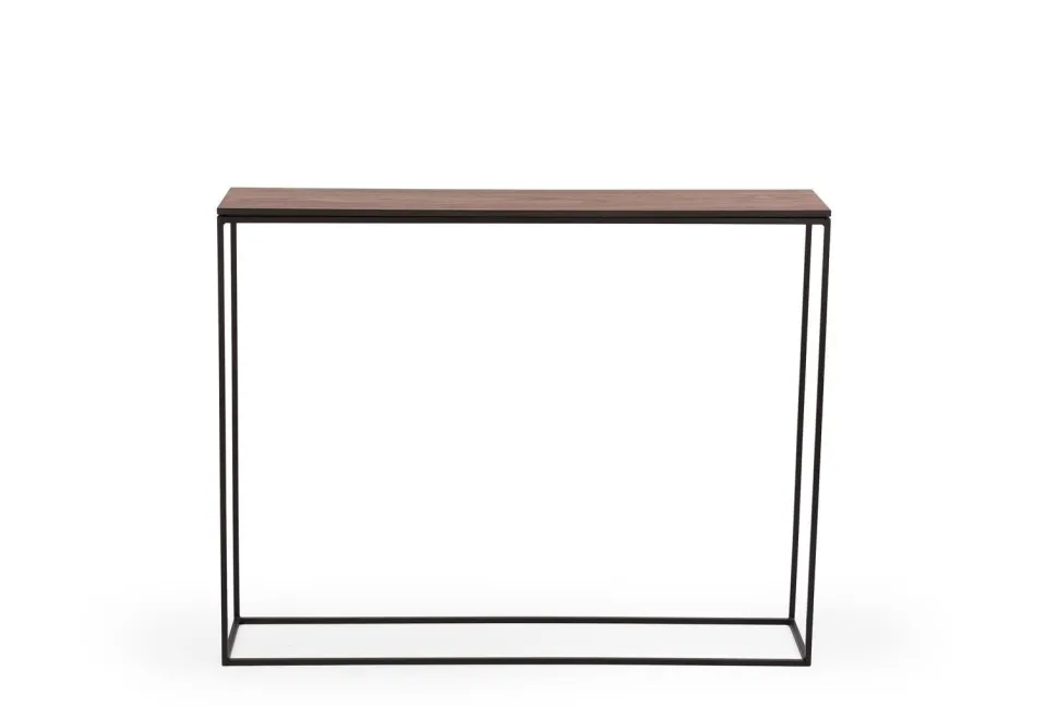 Delikatna forma konsoli STAM 200 to przede wszystkim minimalizm, funkcjonalność i prostota. Dzięki czemu konsola STAM jest uniwersalna i ponadczasowa. Orzechowy blat i czarny metalowy stelaż dobrze łączy się z innymi stylami i jest zawsze na miejscu. WYMIARY: Wysokość: 78 cm Głębokość: 22 cm Szerokość: 100cm MATERIAŁ: Metal, malowany proszkowo. Fornir orzech amerykański, olejowany. Waga: 9,5