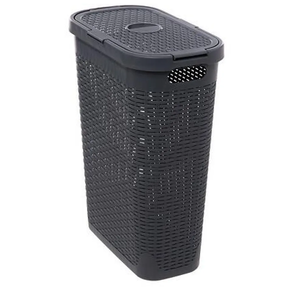 Ceniąc sobie funkcjonalność i estetykę, przedstawiamy wąski kosz na pranie wykonany z technorattanu o pojemności 40 litrów. Jego design nawiązuje do naturalnej plecionki rattanowej, jednak dzięki zastosowaniu polipropylenu, kosz jest odporny na działanie wilgoci, co czyni go idealnym rozwiązaniem do łazienki czy pralni. Szary, ciemny odcień kosza wprowadza do wnętrza nutę elegancji i nowoczesności.