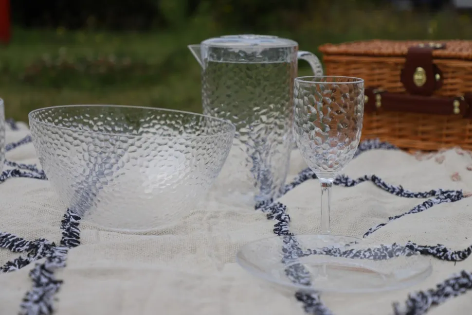 - W zestaw wchodzą 4 talerze, 4 zestawy sztućców, 4 kieliszki oraz kosz.
