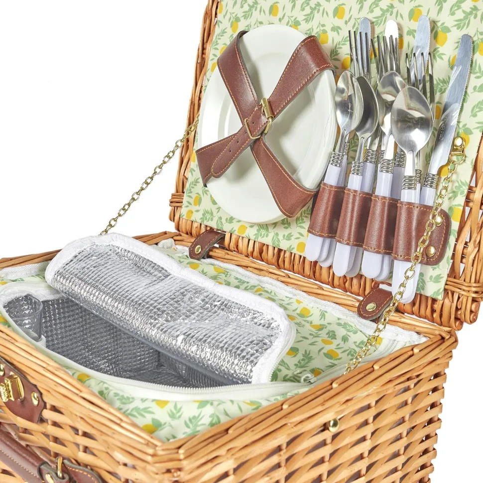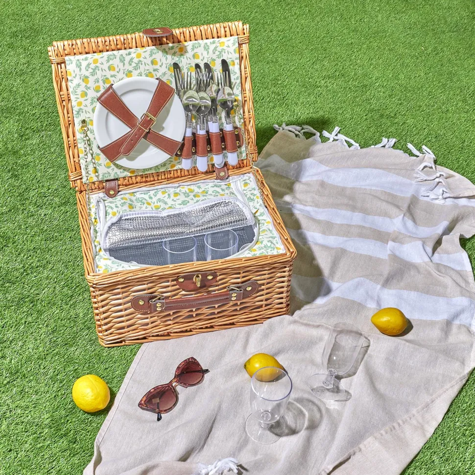 Kosz piknikowy dla czterech osób to idealne rozwiązanie na niedzielne wypady za miasto, rodzinne pikniki czy romantyczne wycieczki. Elegancko zaprojektowany, wyściełany tkaniną z letnimi motywami, kosz ten nie tylko ułatwia organizację posiłków na świeżym powietrzu, ale także dodaje stylu każdej okazji. Wnętrze kosza jest starannie zorganizowane, zawierając komplet sztućców i talerzy dla czterech osób, co pozwala na komfortowy i swobodny posiłek w plenerze.