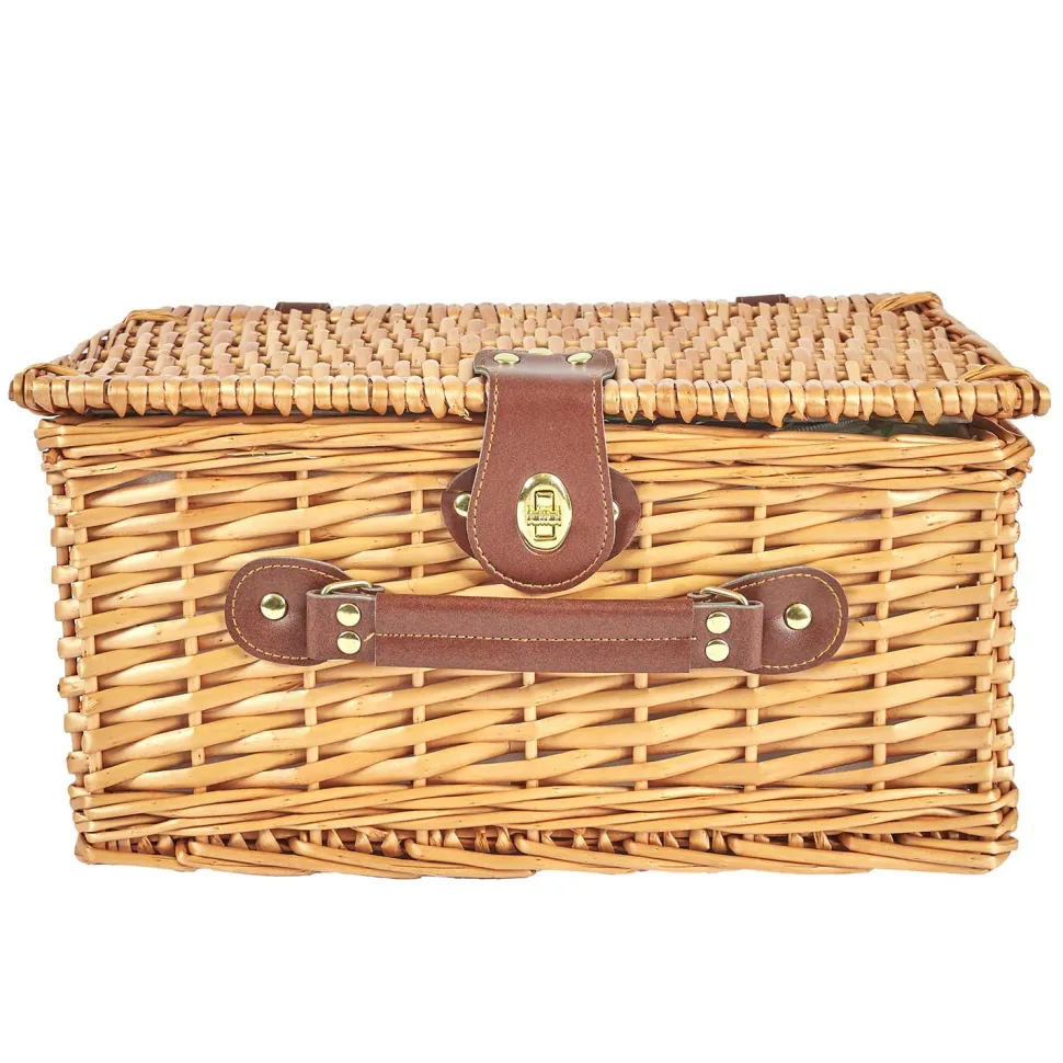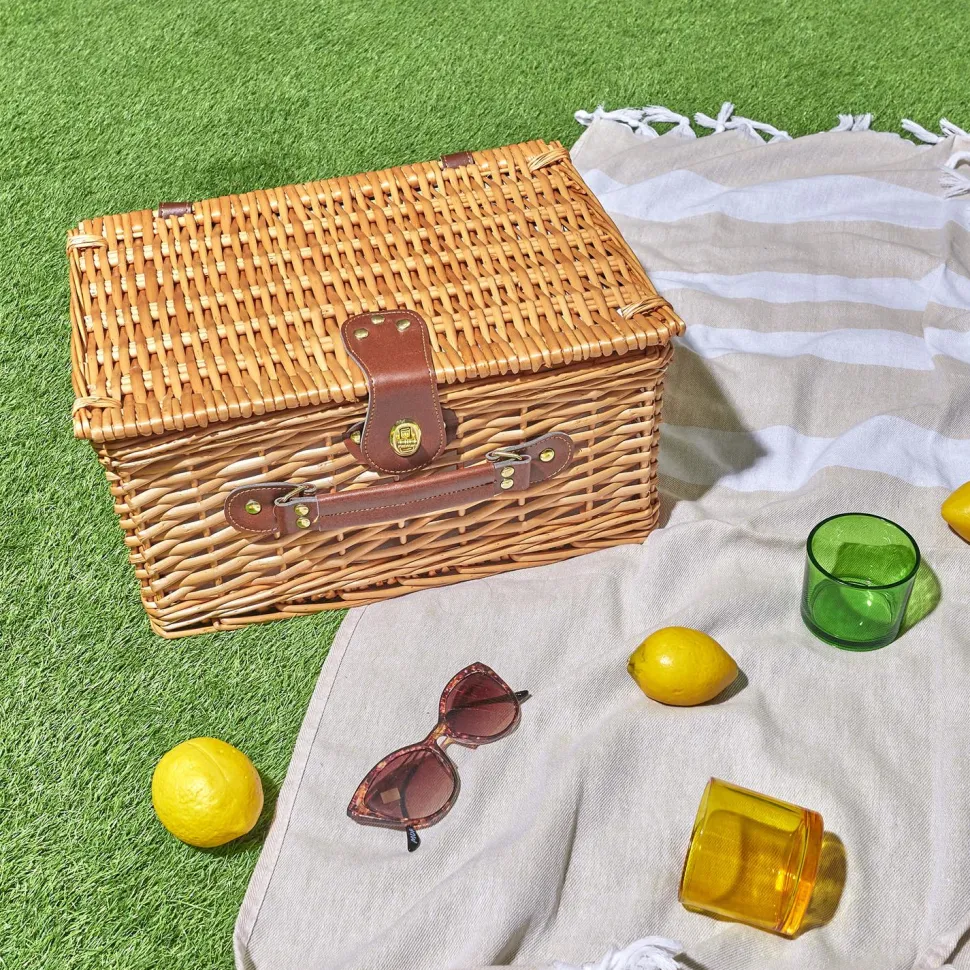 Kosz piknikowy jest wykonany z wytrzymałych materiałów, takich jak plecionka, stal nierdzewna i tworzywo sztuczne, co gwarantuje jego trwałość i estetyczny wygląd. Uchwyt z eko skóry ułatwia przenoszenie kosza, a solidne zamknięcie zapewnia bezpieczne przechowywanie zawartości. Kiedy kosz nie jest używany, może służyć jako elegancka dekoracja w domu, wnosząc element naturalnego uroku dzięki swojej plecionej obudowie.