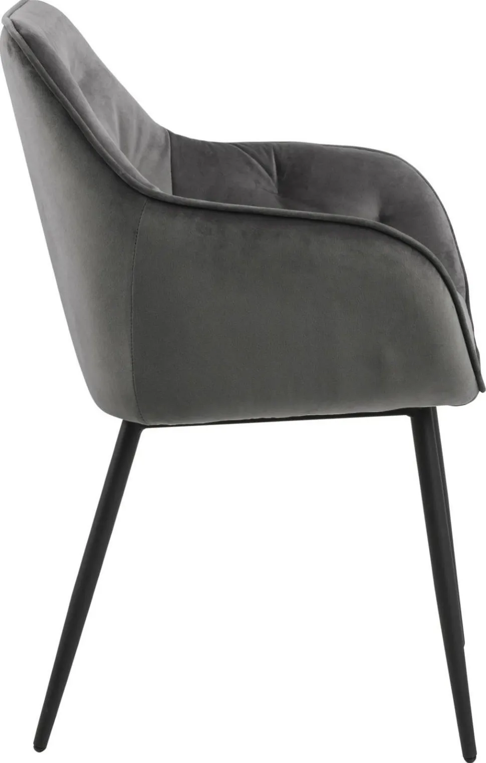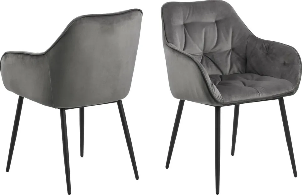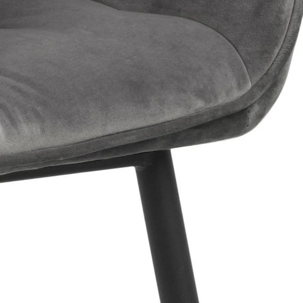 Krzesło Brooke jest krzesłem tapicerowanym miękką welwetową tkaniną VIC fabric dark grey 28. Krzesło posiada idealnie wyprofilowane podłokietniki, które tworzą z siedziskiem i oparciem spójną całość. Oparcie krzesła zostało ozdobione pikowaniem, które dodaje mu stylu. Podstawą krzesła są malowane proszkowo na czarno metalowe nogi. Maksymalne obciążenie: 120 kg. Waga Krzesła: 8,8 kg