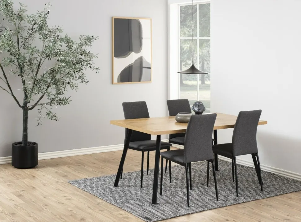 Krzesło Demina to krzesło, które doskonale sprawdzi się w przestrzeni hotelowej, komercyjnej czy domowej. Prosta forma krzesła sprawia, że krzesło dopasuje się do każdego stylu we wnętrzu. Siedzisko zostało obite mocną tkaniną Sawana fabric grey 5, nogi natomiast wykonane zostały z metalu pomalowanego proszkowo na czarno. Krzesło ma prostą i smukłą budowę, dzięki czemu dopasuje się do każdego nawet najbardziej nietypowego stołu. Krzesło jest niebywale lekkie i waży 4,8 kg. Maksymalne obciążenie: 120 kg