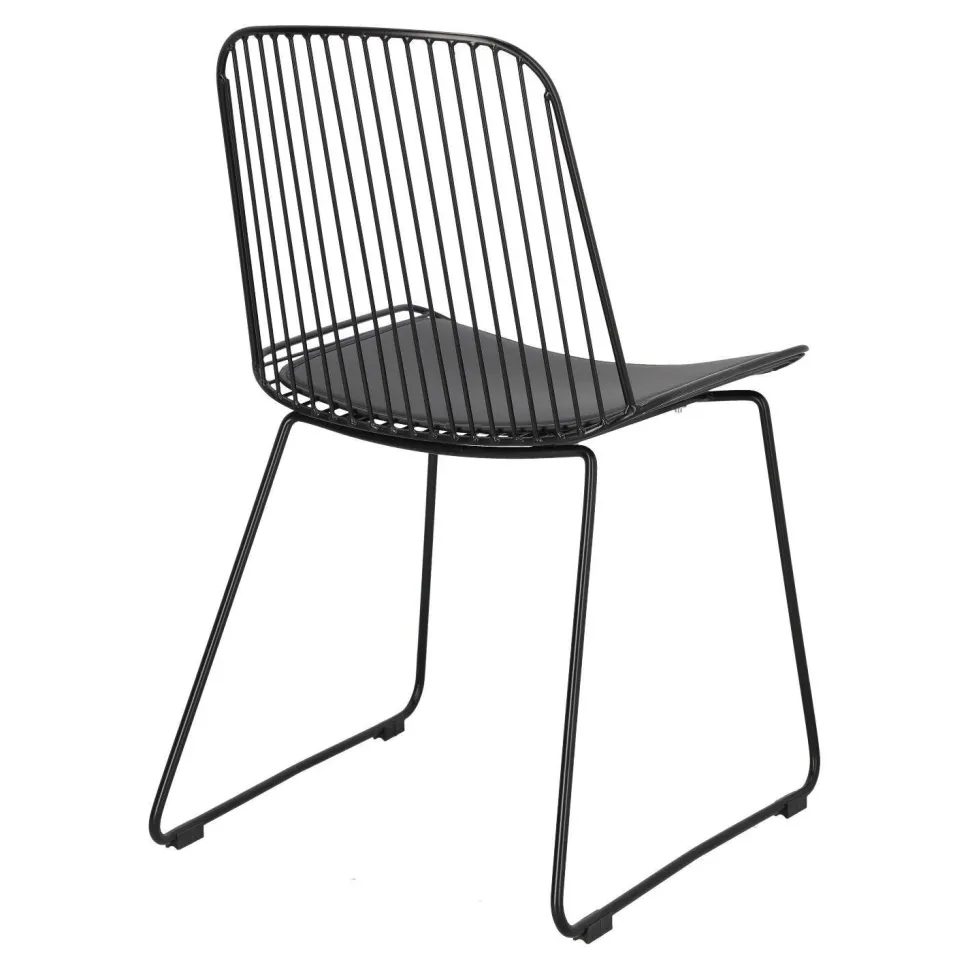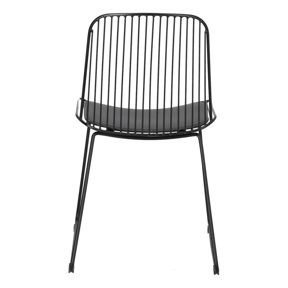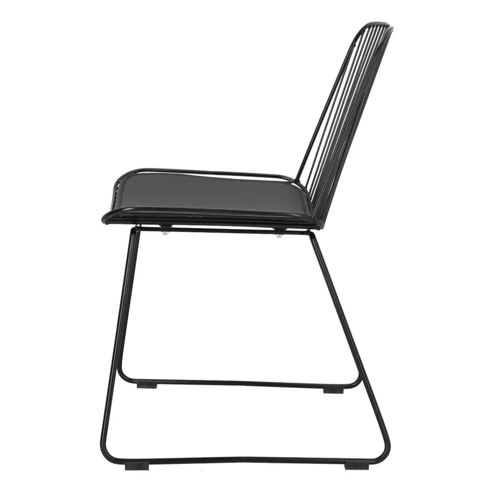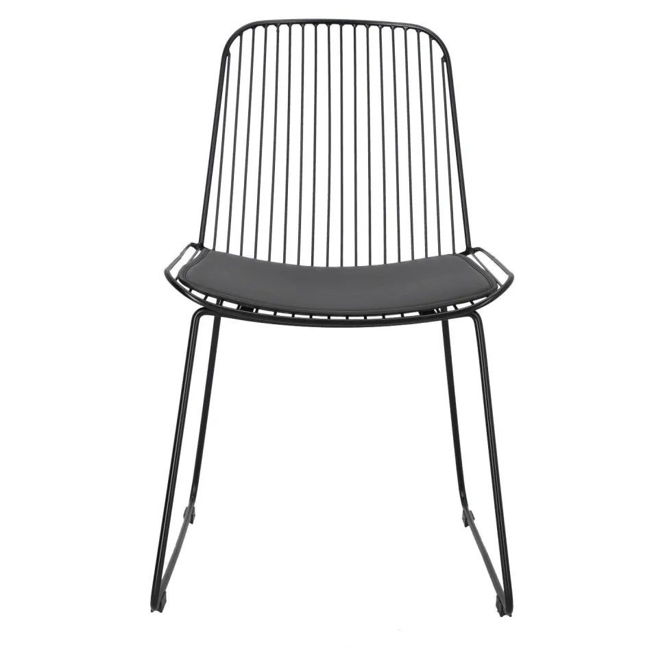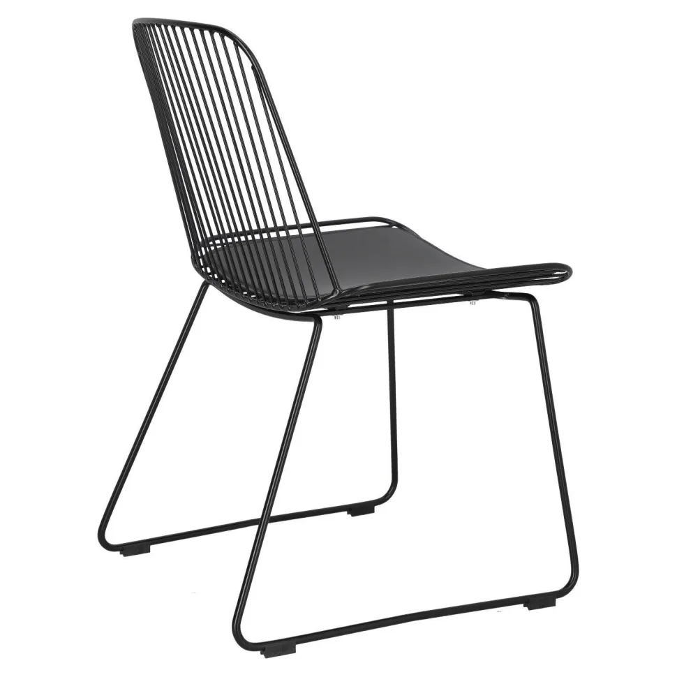 Krzesło Dill to designerska propozycja dla osób ceniących niezależne wyjątkowe projekty. Czarne loftowe krzesło ze zdejmowaną poduszką z eko skóry to odważny model, który zachwyca swoją oryginalnością. Ażurowe krzesło sprawdzi się jako krzesło do jadalni, kuchni i salonu. Ciekawym pomysłem będzie na przykład wykorzystanie kilku krzeseł połączonych z innymi siedziskami. Dill będzie prezentować się bardzo dobrze zarówno w komplecie, jak i pojedynczo. Zachwycające w swojej prostocie krzesło będzie nie tylko wygodnym siedziskiem, ale również ozdobą. Krzesło o siedzisku oraz oparciu wykonanym z wielu cienkich przęseł będzie nietypowym elementem każdego wnętrza. Podstawa krzesła to płozy zabezpieczone nakładkami z tworzywa, które zapobiegają rysowaniu się podłoża. Konstrukcja z metalu pomalowanego proszkowo na czarno utrzymana została w półmatowym wykończeniu.