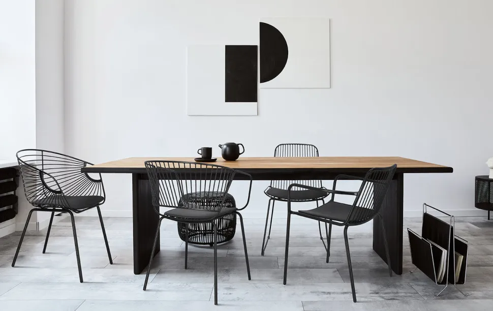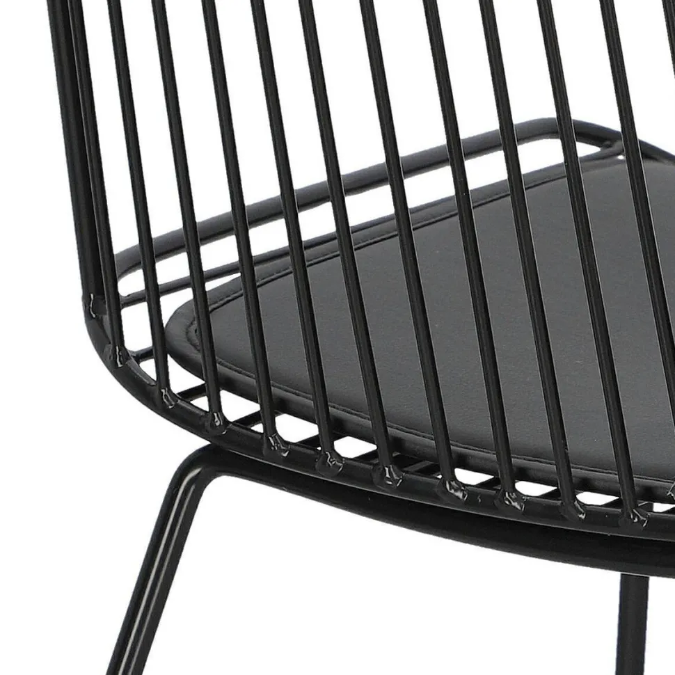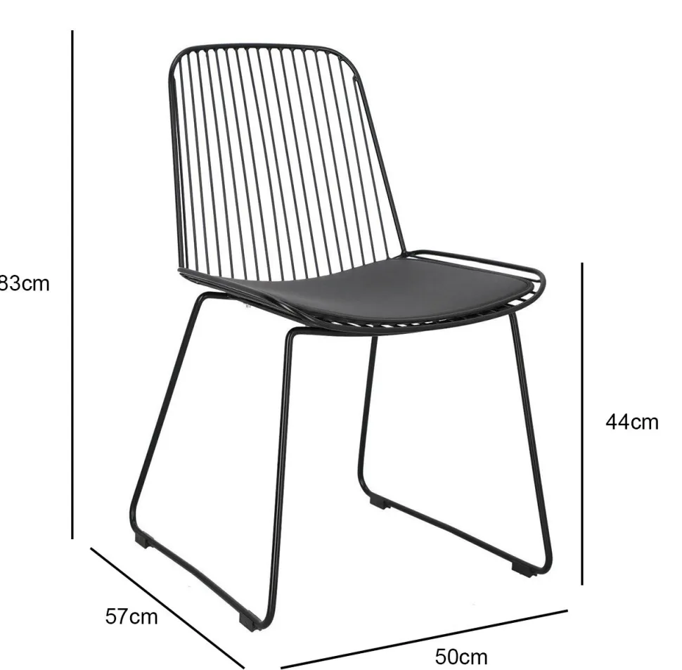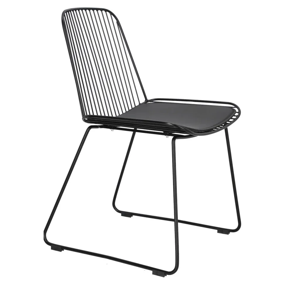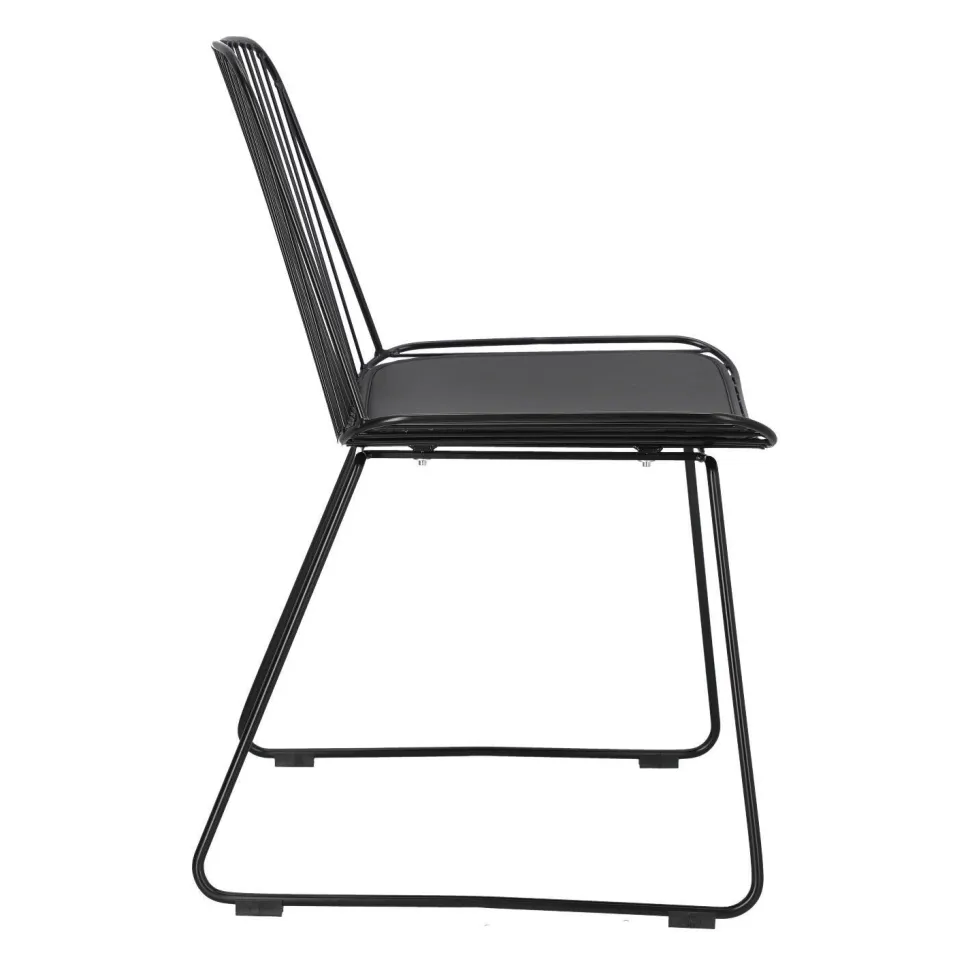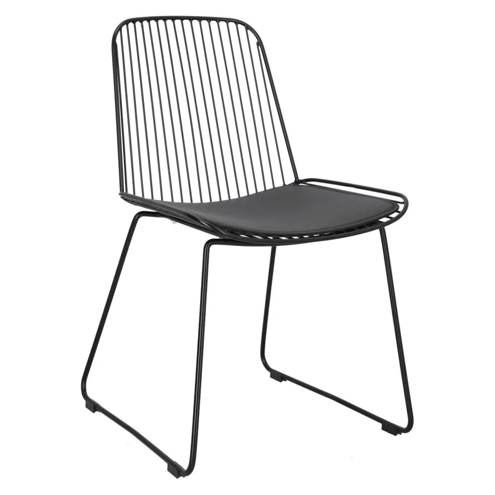 Krzesło Dill to designerska propozycja dla osób ceniących niezależne wyjątkowe projekty. Czarne loftowe krzesło ze zdejmowaną poduszką z eko skóry to odważny model, który zachwyca swoją oryginalnością. Ażurowe krzesło sprawdzi się jako krzesło do jadalni, kuchni i salonu. Ciekawym pomysłem będzie na przykład wykorzystanie kilku krzeseł połączonych z innymi siedziskami. Dill będzie prezentować się bardzo dobrze zarówno w komplecie, jak i pojedynczo. Zachwycające w swojej prostocie krzesło będzie nie tylko wygodnym siedziskiem, ale również ozdobą. Krzesło o siedzisku oraz oparciu wykonanym z wielu cienkich przęseł będzie nietypowym elementem każdego wnętrza. Podstawa krzesła to płozy zabezpieczone nakładkami z tworzywa, które zapobiegają rysowaniu się podłoża. Konstrukcja z metalu pomalowanego proszkowo na czarno utrzymana została w półmatowym wykończeniu.