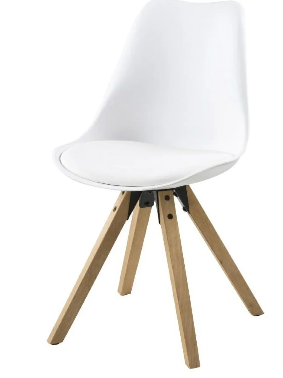 Podstawa krzesła Dima wykonana została natomiast z olejowanego drewna kauczukowego. Jego powierzchnia pokryta jest bejcą w kolorze dębu, co podkreśla naturalny wygląd drewna, a jednocześnie zabezpiecza podstawę przed zniszczeniami. Cztery grube drewniane nogi ustawione pod kątem zapewniają bezpieczeństwo i stabilność. Krzesło wymaga montażu podstawy do siedziska za pomocą śrub.