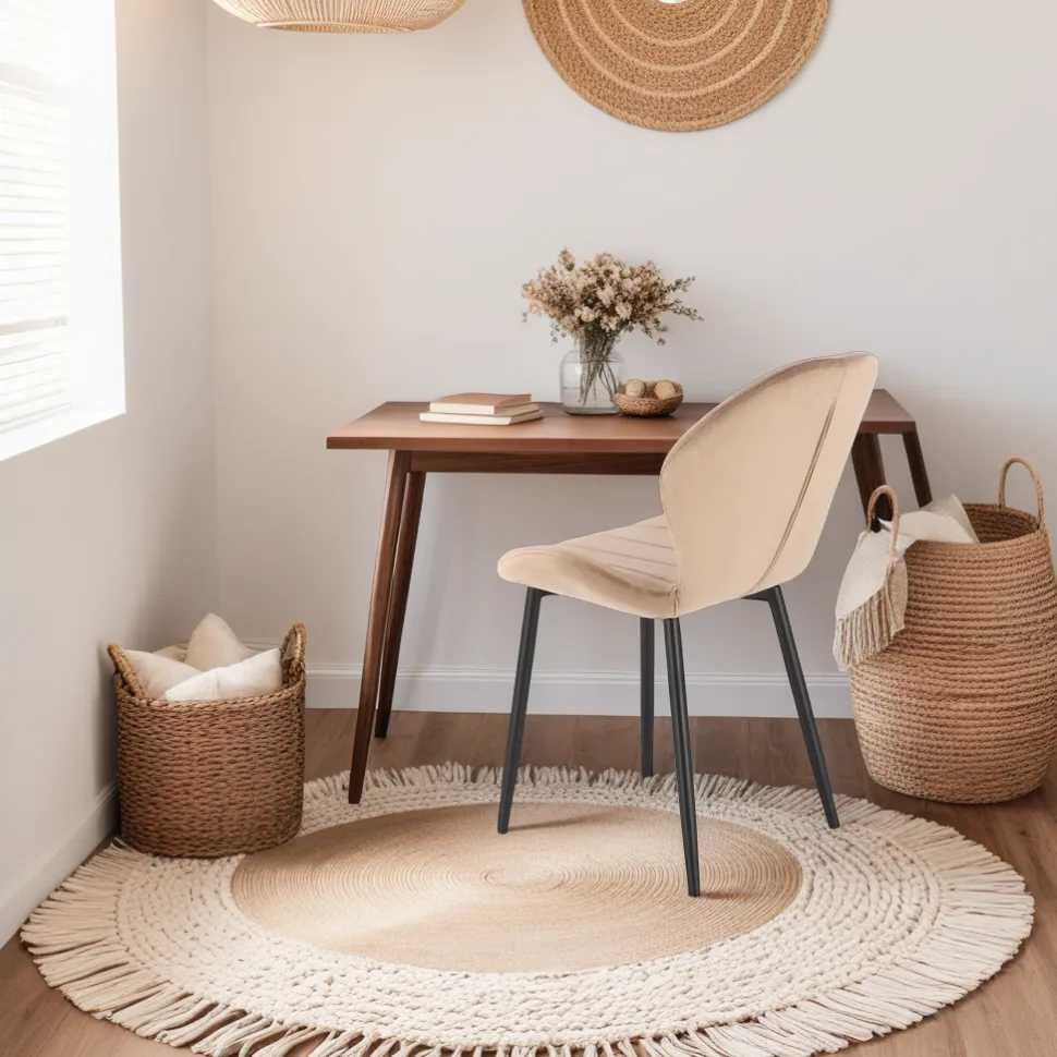 Krzesło Eve – elegancja i komfort w jednym meblu Krzesło Eve to połączenie funkcjonalności i wyrafinowanego designu, które stworzy idealny akcent w Twoim wnętrzu. Jego solidna podstawa z czarnej stali malowanej proszkowo to nie tylko gwarancja trwałości, ale także nowoczesnego wyrazu. Siedzisko krzesła wykonane z przyjemnej w dotyku tkaniny welurowej w stonowanymbeżowym kolorze jest zaprojektowane z myślą o Twoim komforcie. Pikowane siedzisko nie tylko nadaje meblowi elegancji, ale również zapewnia wygodę podczas długotrwałego siedzenia. To idealny mebel na chwile relaksu czy do spotkań przy stole. Krzesło Eve to także szeroka paleta modnych kolorów do wyboru, co pozwala dostosować je do swojego osobistego gustu oraz charakteru pomieszczenia. Widoczne przeszycia na siedzisku dodają meblowi subtelnego uroku, co czyni je nie tylko funkcjonalnym, ale także dekoracyjnym elementem wystroju wnętrza. Krzesło Eve to nie tylko miejsce do siedzenia, to wyraz Twojego stylu i wyjątkowości wnętrza. Przygotuj się na mądry wybór! Krzesło Eve to harmonia designu i wygody. Stalowa podstawa malowana proszkowo gwarantuje trwałość i nowoczesny wygląd. Pikowane siedzisko z miłej w dotyku tkaniny welurowej dostarcza niezrównanego komfortu. Dostępność wielu modnych kolorów umożliwia dopasowanie krzesła do każdego wnętrza. Widoczne przeszycia dodają meblowi uroku i elegancji.