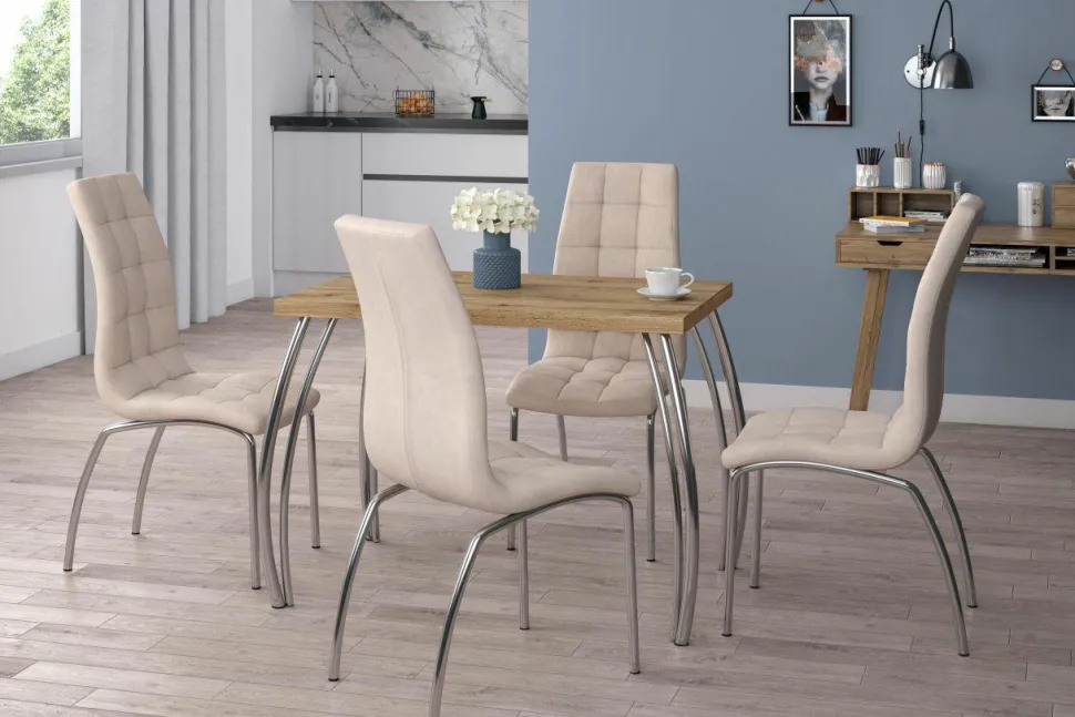 - Kontrastowy design: beżowa tapicerka z srebrnym stelażem