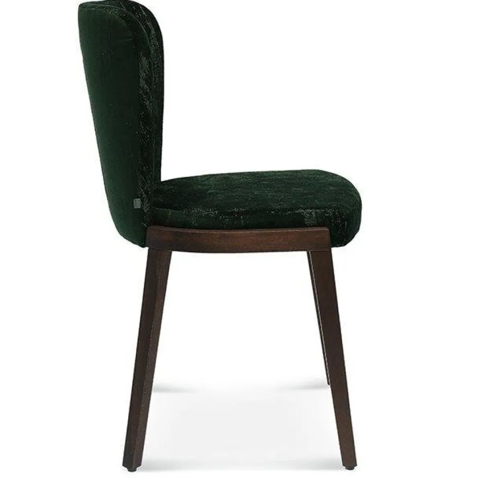 Krzesło wykonane z drewna dębowego (możliwość wyboru wybarwienia) to propozycja do jadalni lub restauracji. Wyróżnia się lekko poszerzającym się u góry oparciem. Posiada również wygodne, szerokie siedzisko. Zarówno oparcie jak i siedzisko pokryte są tapicerką (wybór tkaniny). Nogi krzesła, lekko rozchodzące się na boki, od dołu zabezpieczone są specjalnymi nakładkami. Taka konstrukcja sprawia, że krzesło jest bardzo stabilne i bezpieczne w użytkowaniu.