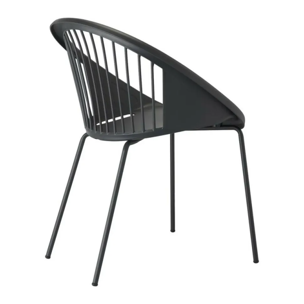 Krzesło sztaplowane Giulia w antracytowym kolorze jest idealne na balkony, tarasy i do ogrodów. To stylowe krzesło wykonane jest z technopolimeru podlegającego recyklingowi i posiada solidną metalową podstawę z poliestrowym wykończeniem, co sprawia, że jest odporne na warunki atmosferyczne.
