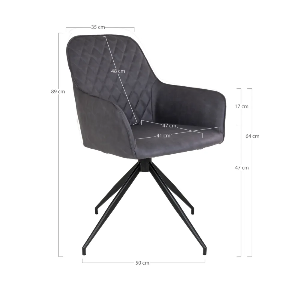Krzesło Harbo to wyjątkowe połączenie stylu i praktyczności. Jego eleganckie, szare siedzisko wykonane z ekoskóry zwraca uwagę swoim ciemnym odcieniem, który idealnie komponuje się z czarną, stalową podstawą. Dzięki obrotowemu siedzisku, krzesło to jest niezwykle funkcjonalne – nie musisz odsuwać go od stołu, aby wstać. To doskonałe rozwiązanie dla małych przestrzeni, gdzie każdy centymetr ma znaczenie.