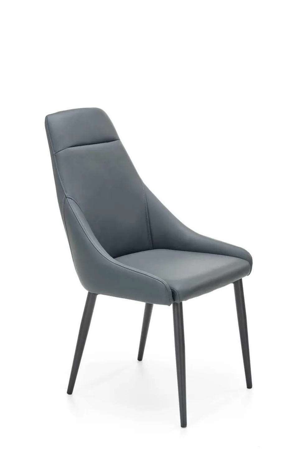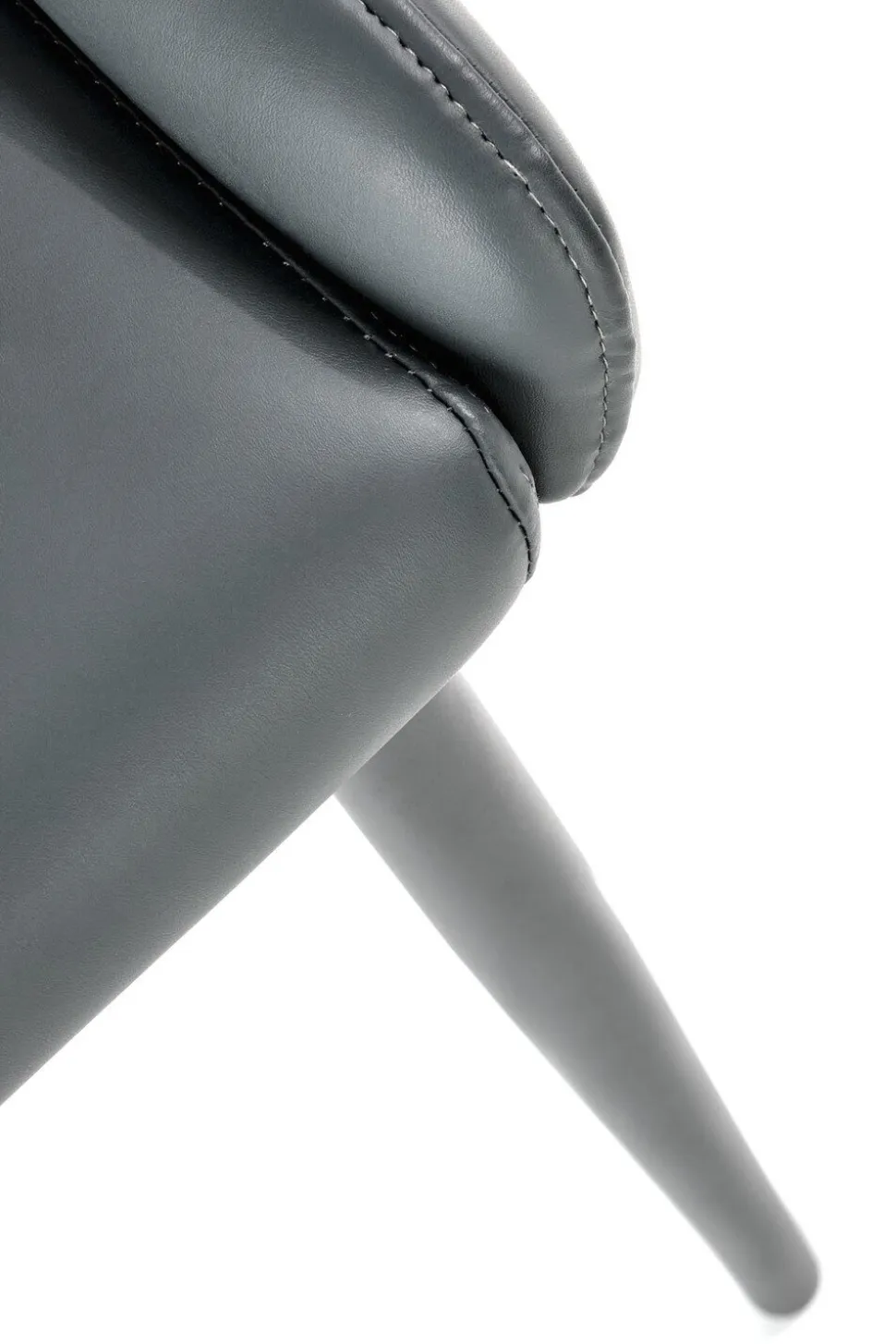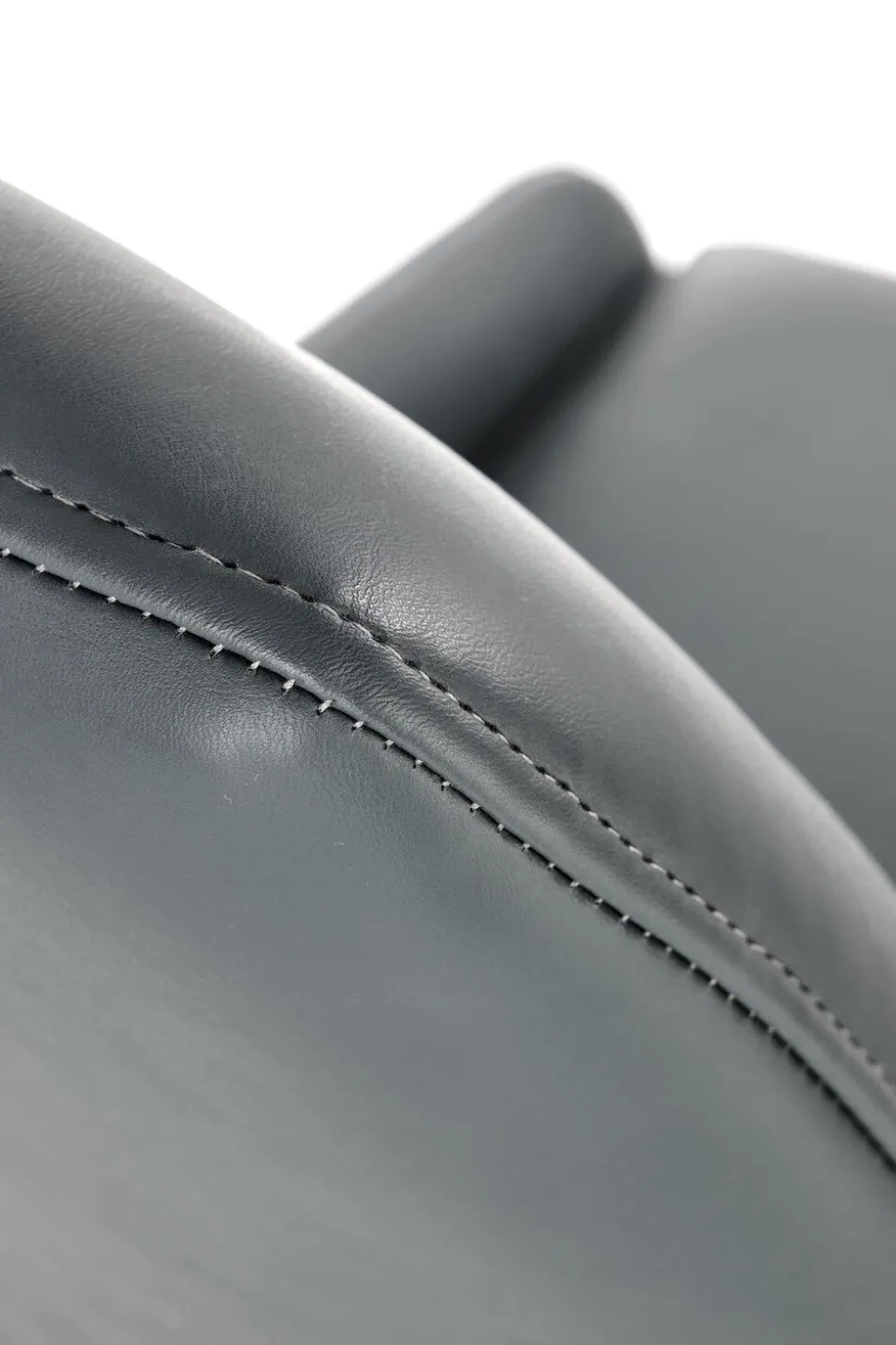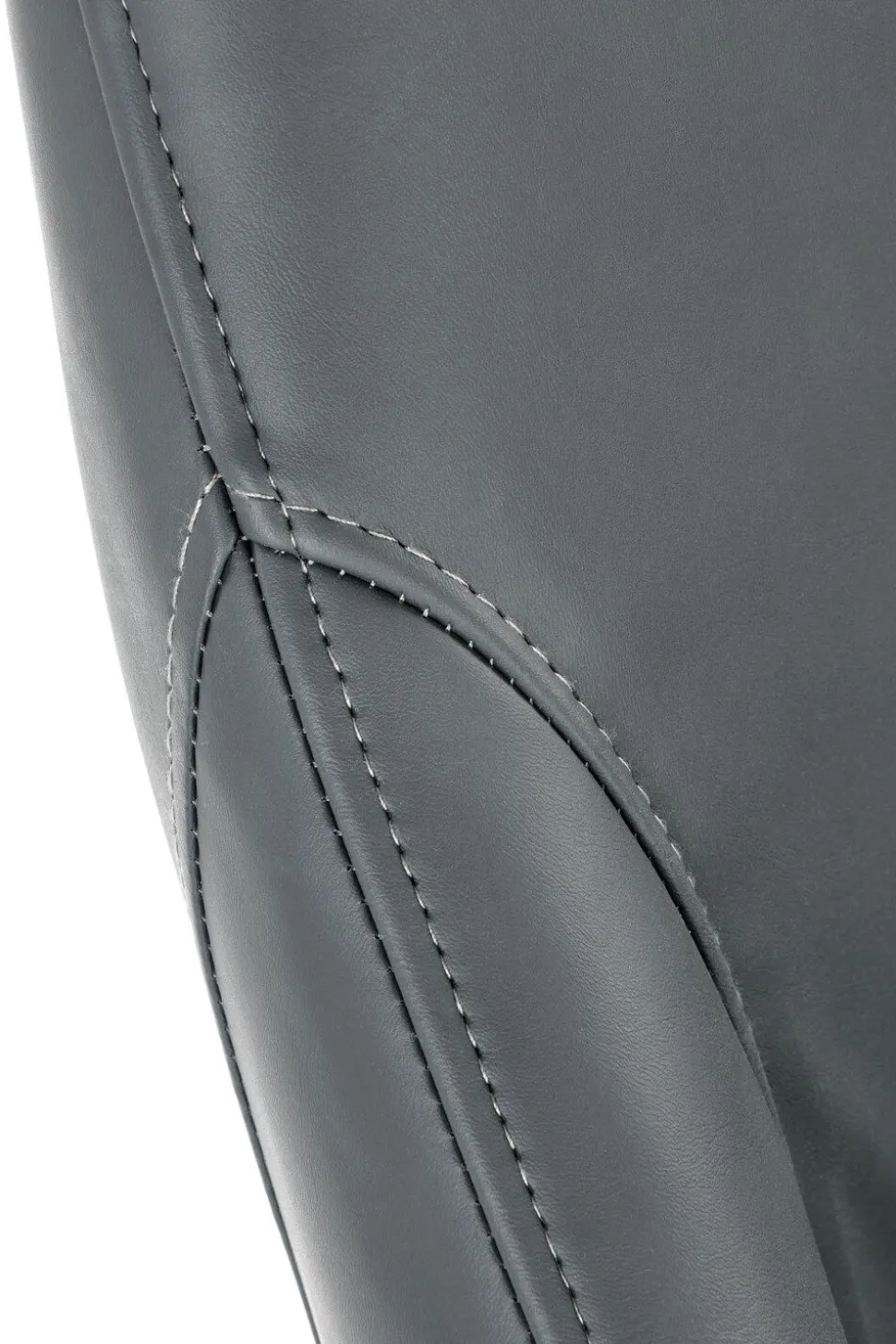 - Ekoskóra w ciemnym popielatym kolorze, widoczne przeszycia oraz podstawa z malowanej proszkowo stali nadają mu unikalny wygląd