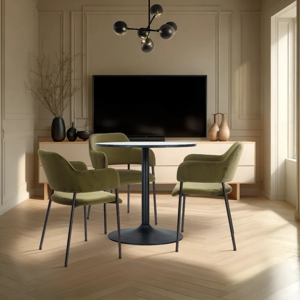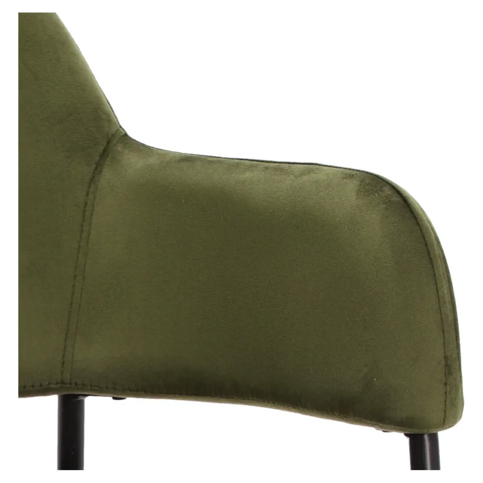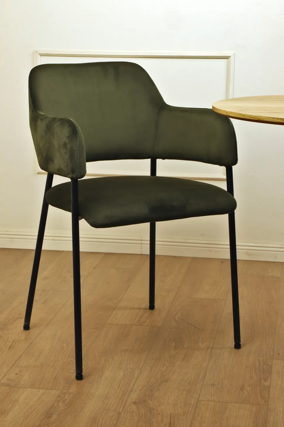Krzesło z podłokietnikami Lima to elegancki model o bardzo modnym kształcie siedziska, przypominającym siedziska z lat 60. Jednak jego forma idealnie wpasuje się nie tylko w aranżacje vintage, ale stanie się także ciekawym dodatkiem do wnętrz nowoczesnych, minimalistycznych czy skandynawskich. Podstawa krzesła to cztery metalowe nogi o smukłym kształcie. Nóżki od spodu zabezpieczono nakładkami, aby uniknąć rysowania się podłogi drewnianej lub gresu. Siedzisko natomiast zostało wypełnione elastyczną pianką poliuretanową, gwarantującą niebywałą miękkość. Tapicerowane siedzisko obito tkaniną Dublin fabric olive green 52. Mebel posiada podłokietniki wyprofilowane wraz z oparciem z jednego elementu. Lima to perfekcyjne krzesło dojadalni, biura czy restauracji.