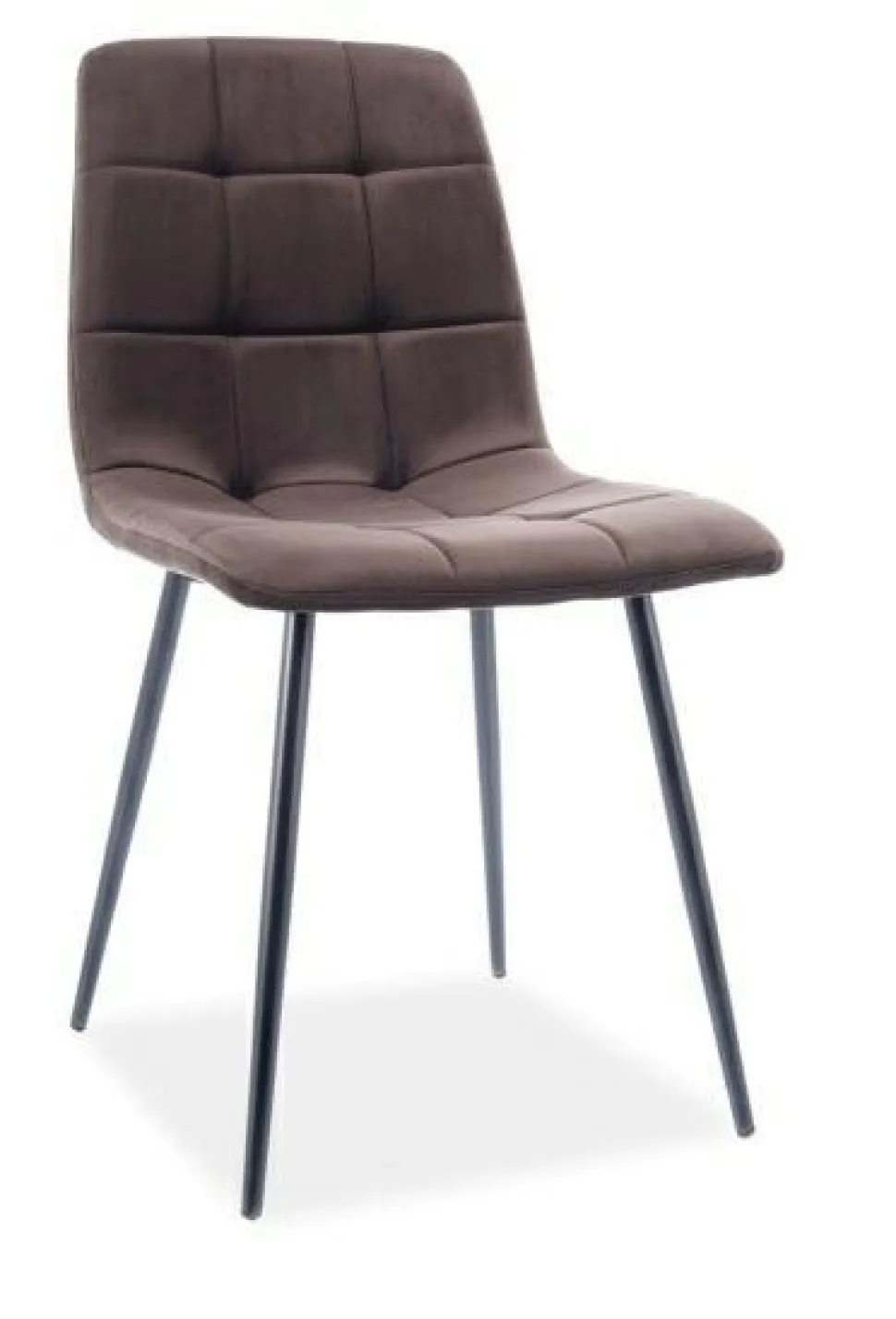 Krzesło Intesi Mello to połączenie niezwykle miękkiej tkaniny welwetowej i metalowych, minimalistycznych nóg. Czarne, malowane proszkowo nogi są wykonane z metalu. Cylindryczny kształt nóg lekko zwęża się w najniższej części mebla. Na uwagę zasługuje ciekawe, minimalistyczne siedzisko krzesła. Siedzisko i oparcie tworzą jedną całość, przez co krzesło jest niezwykle delikatne w swojej formie. Brak podłokietników sprawia, że krzesła mogą być umieszczone przy każdym stole.