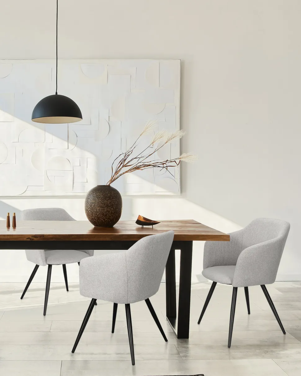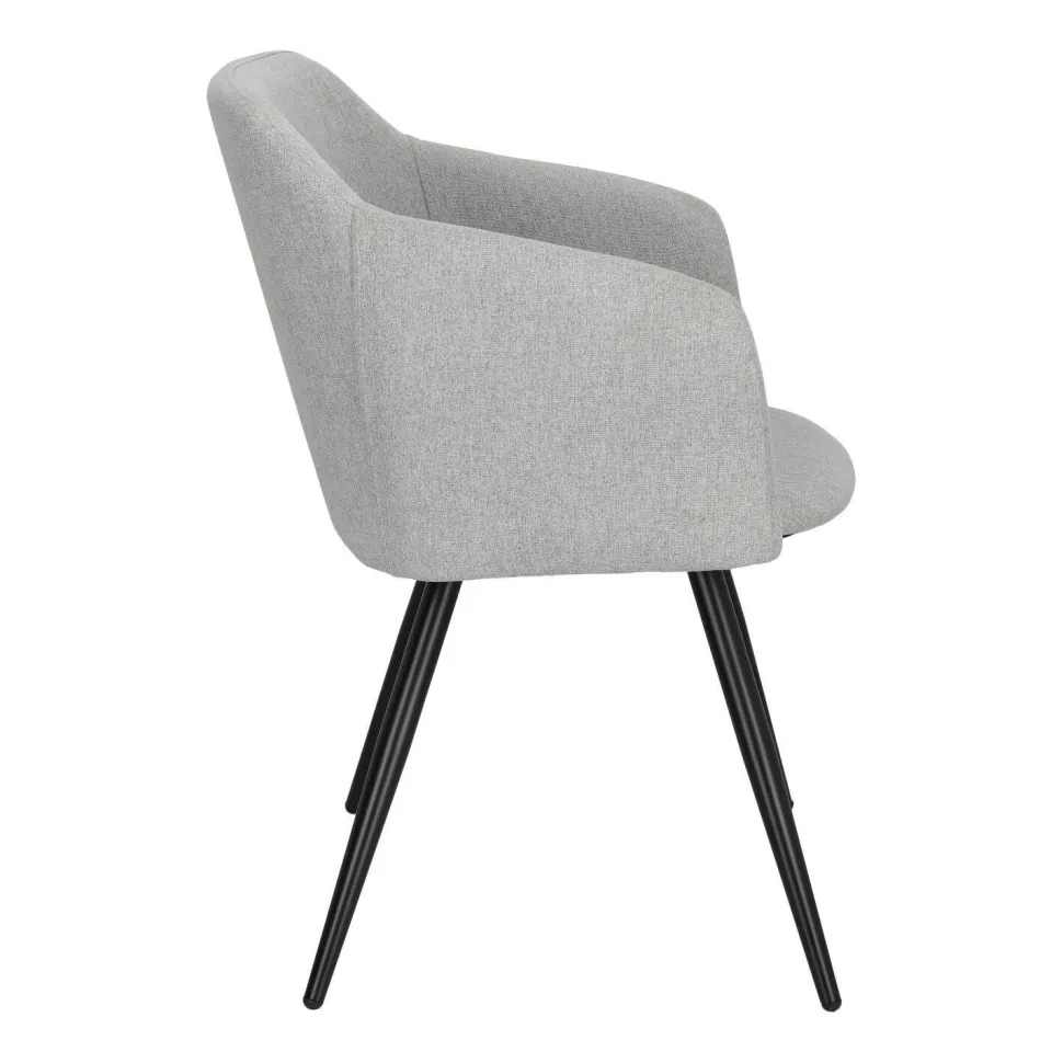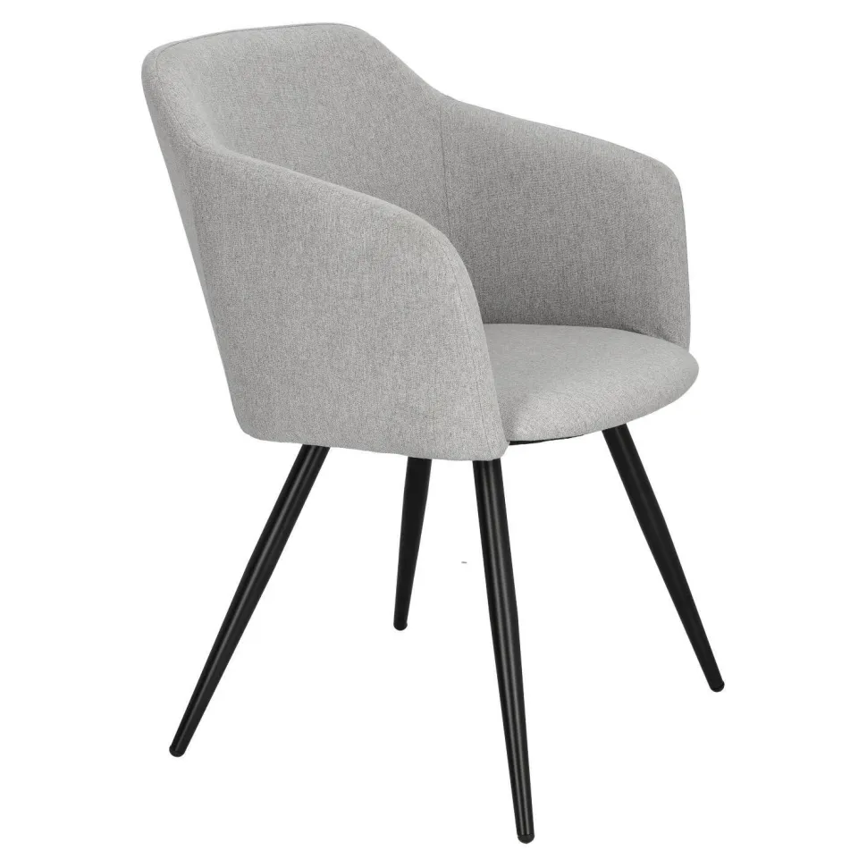 Krzesło Molto tapicerowane elegancką szarą tkaniną to przykład klasycznego designu, który świetnie odnajdzie się w różnorodnych aranżacjach. Posiada ono niezwykle wygodne siedzisko z szerokim oparciem i podłokietnikami, a także miękką poliestrową tapicerkę, która zapewnia dodatkowy komfort. Ciekawa kubełkowa forma krzesła tapicerowanego Molto idealnie współgra ze smukłymi, lecz wytrzymałymi nogami o grubości 3,5 cm. Podstawa to łatwa do utrzymania w czystości konstrukcja z metalu w kolorze czarnym. Dodatkowo nogi wyposażone zostały w nakładki, które chronią podłogę przed zarysowaniem. Eleganckie szare krzesło o wymiarach 42 cm x 82 cm x 60 cm (głębokość siedziska: 46 cm) będzie doskonałym wyborem do wnętrz w stylu skandynawskim.