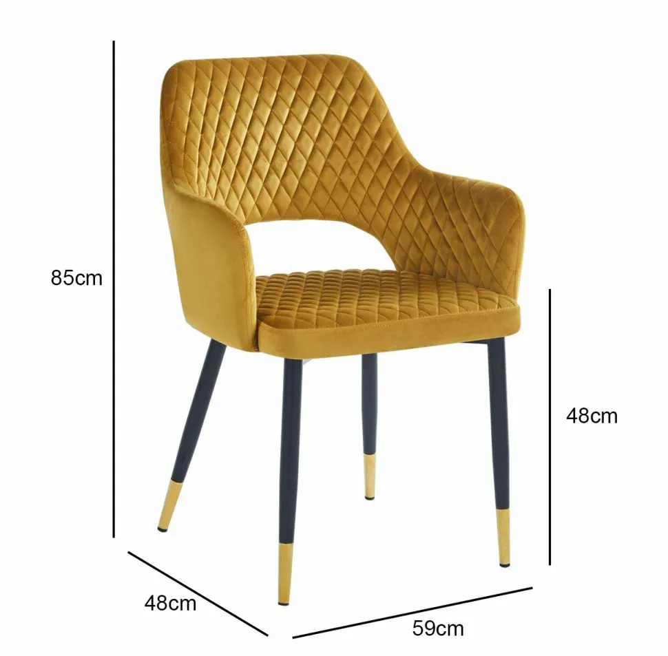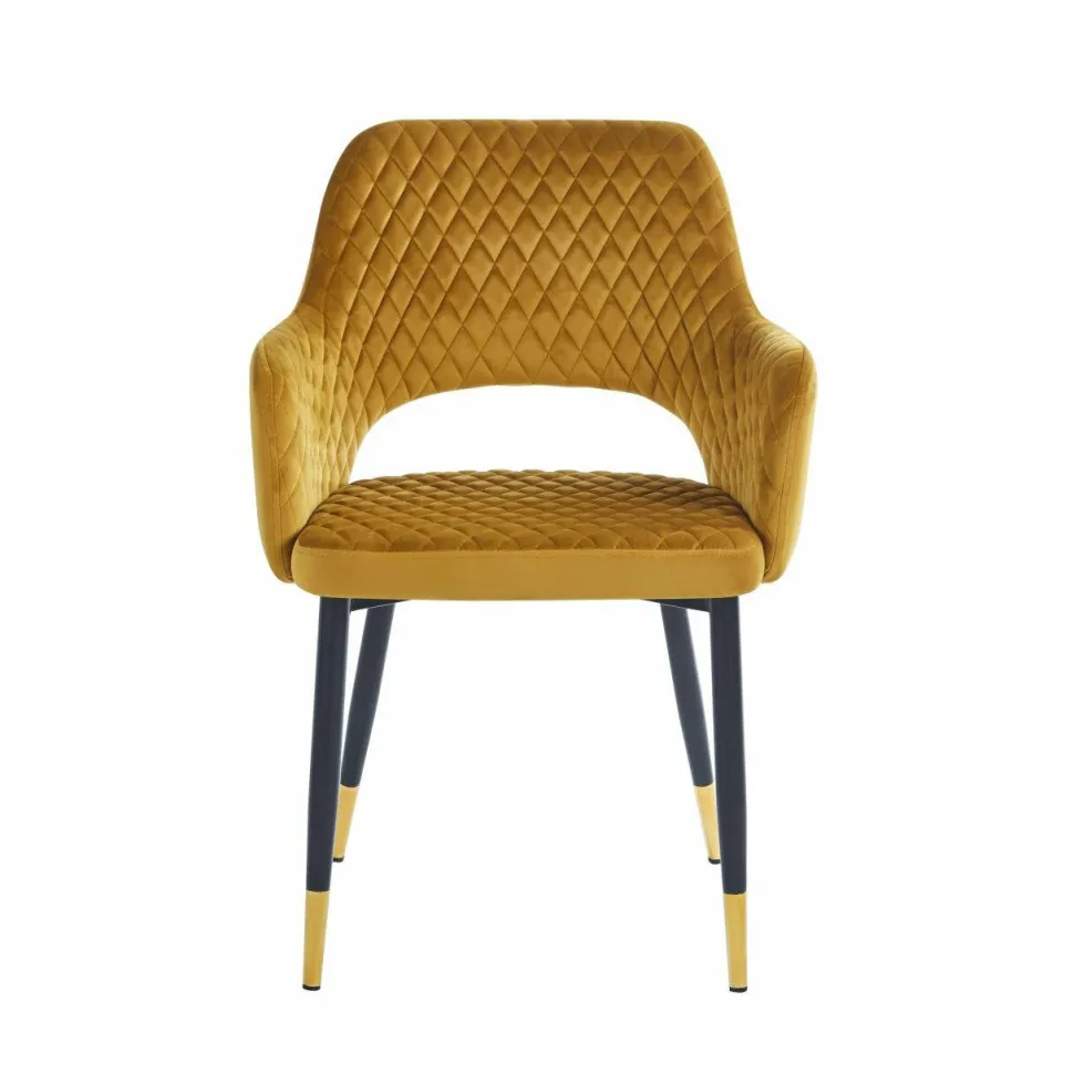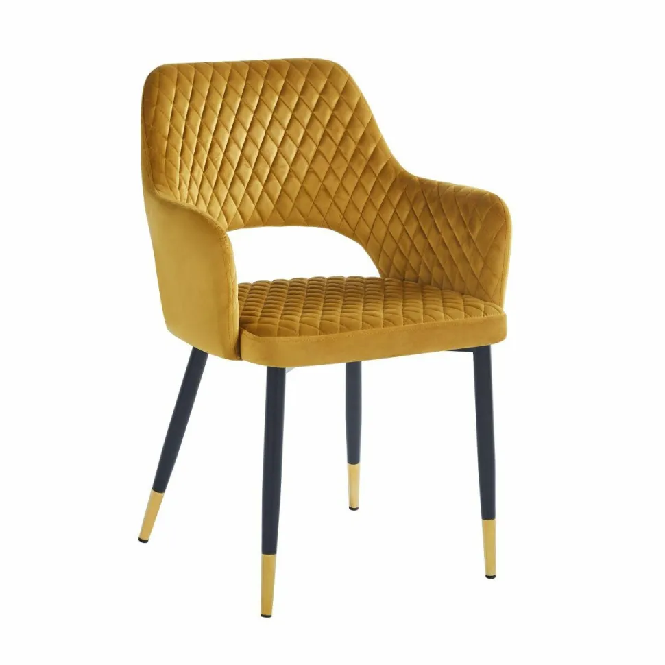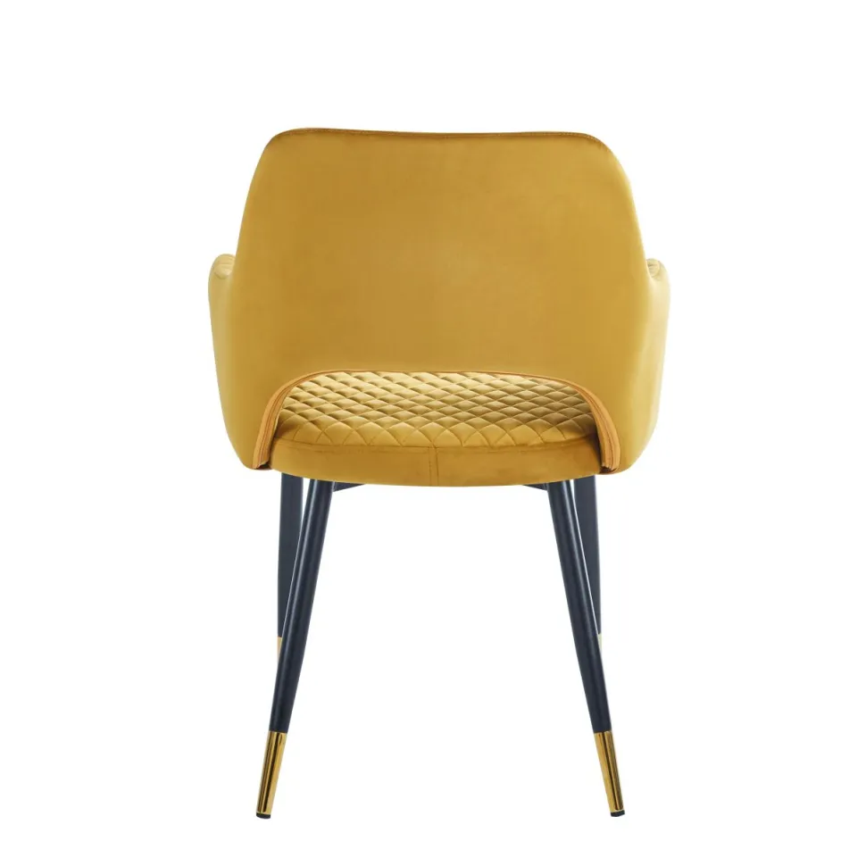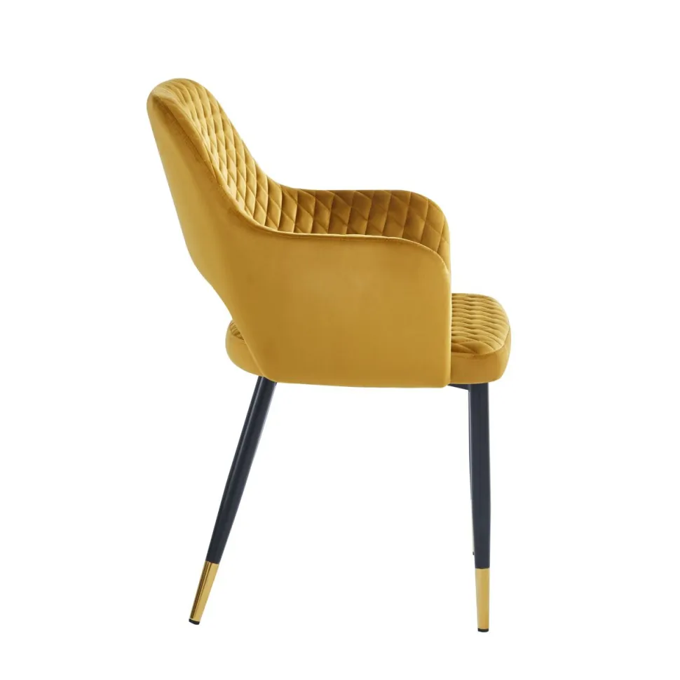 - Eleganckie krzesło z tapicerką velvet w kolorze musztardowym.