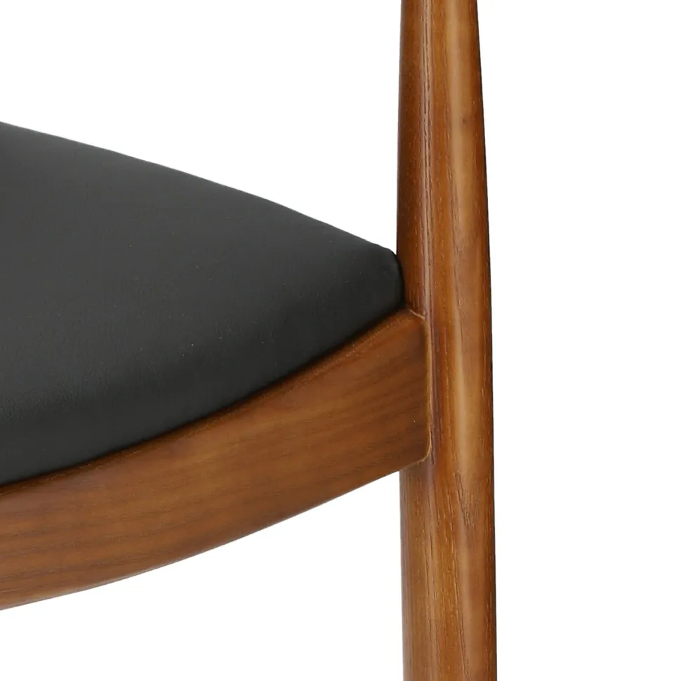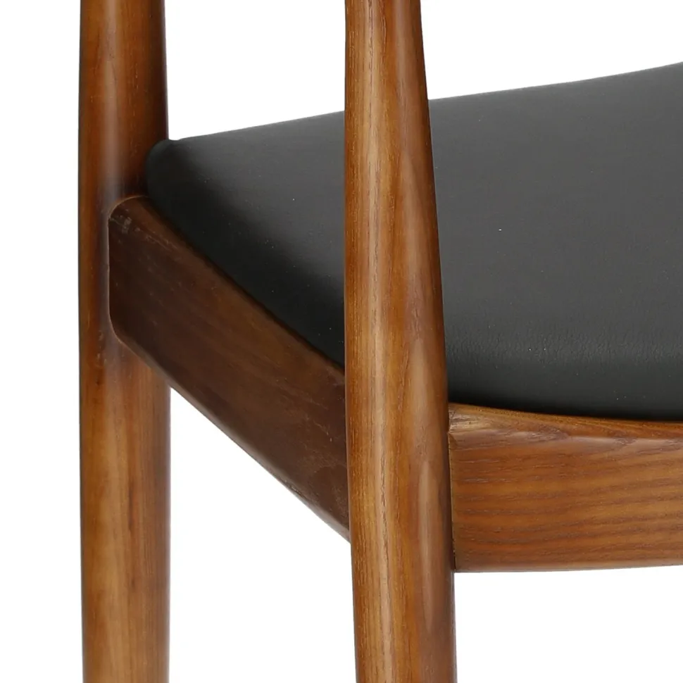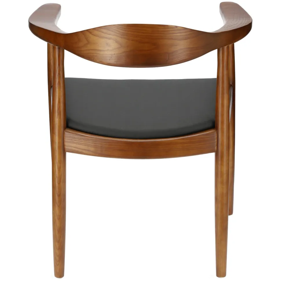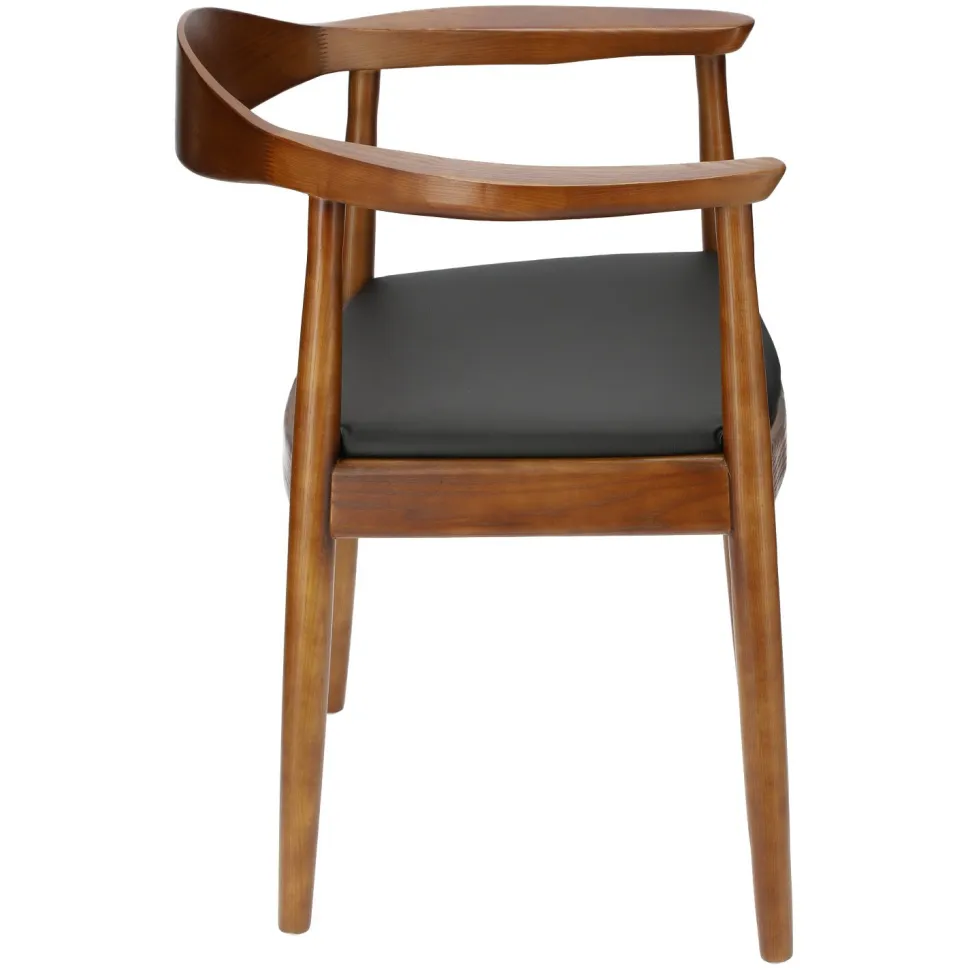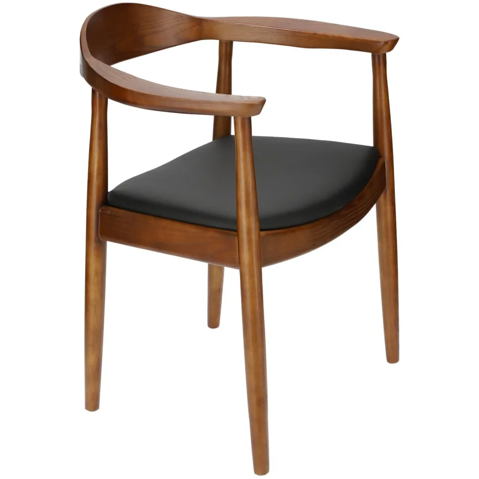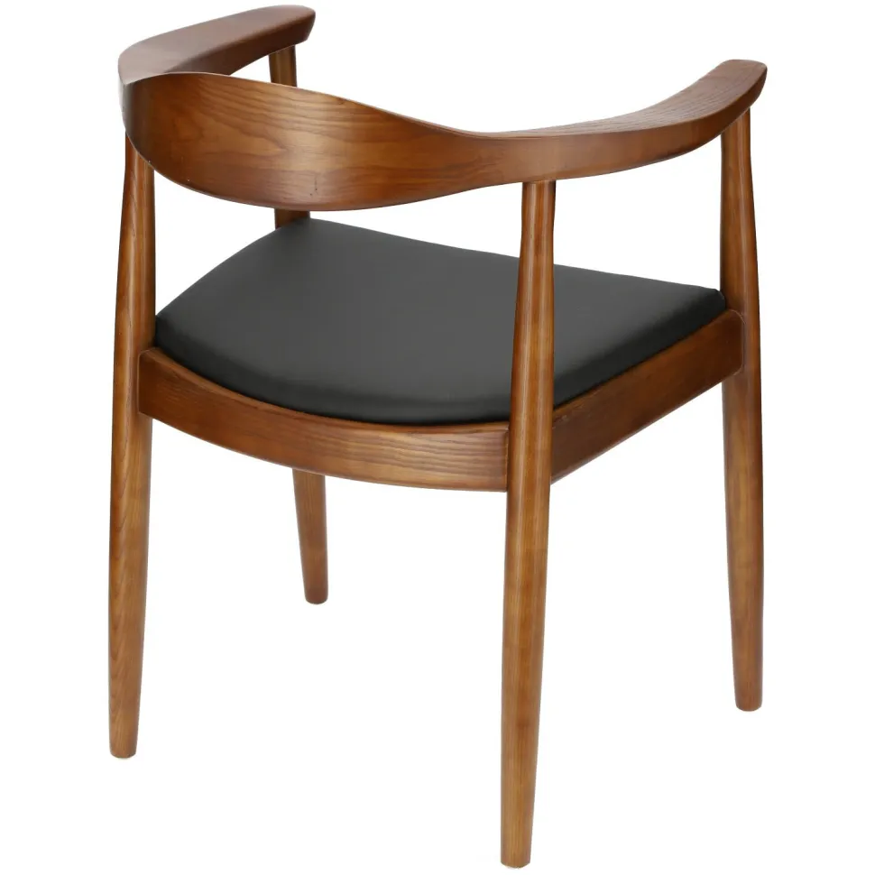 Krzesło President inspirowane słynnym projektem Hansa Wegnera z 1949 roku to przykład piękna czerpiącego z prostoty. Wykonane z litego drewnabukowego krzesło zachwyca swoją subtelną zaokrągloną formą. Delikatna krzywizna oparcia harmonijnie przechodzi w zaokrąglone podłokietniki, a miękkie siedzisko z czarnej eko skóry zaprasza do wygodnego wyciągnięcia się na krześle. Każdy element krzesła drewnianego President zachwyca precyzją wykonania. Prawie niewidoczne łączenia są znakiem rozpoznawczym cenionych wegnerowskich modeli. Kultowe krzesło z podłokietnikami inspirowane ikoną duńskiego designu wprowadzi do wnętrza nieprzemijającą elegancję i trwałość najwyższej klasy rzemieślnictwa.