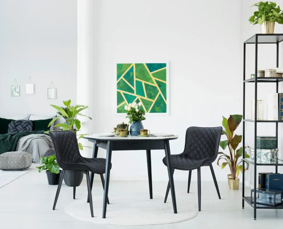 Wykonane z dbałością o detale, krzesło posiada metalową, malowaną proszkowo podstawę, która zapewnia stabilność i trwałość. Cztery solidne nogi zakończone stopkami z tworzywa gwarantują bezpieczne użytkowanie na różnych rodzajach podłóg. Największym atutem krzesła Roxino jest jego siedzisko i oparcie, które tworzą jeden profilowany element. Pokryte miękką pianką tapicerską oraz ekologiczną, czarną skórą, zapewniają nie tylko wygodę, ale również dodają elegancji i stylu. Przeszycia na powierzchni krzesła nadają mu niesztampowego wyglądu, pomimo których, tkanina jest łatwa w czyszczeniu. Dzięki temu krzesło Roxino będzie wyglądać zawsze świetnie, nawet po intensywnym użytkowaniu.