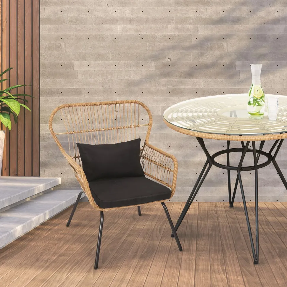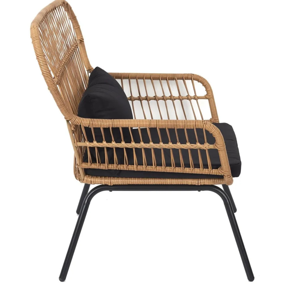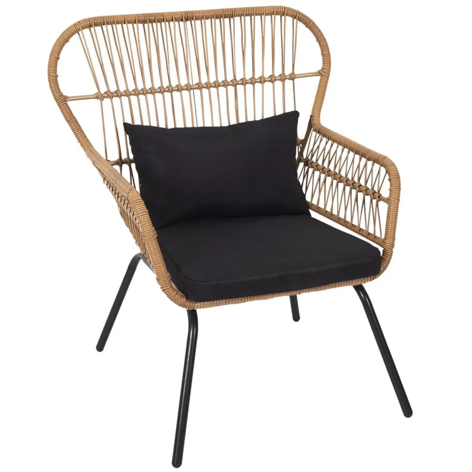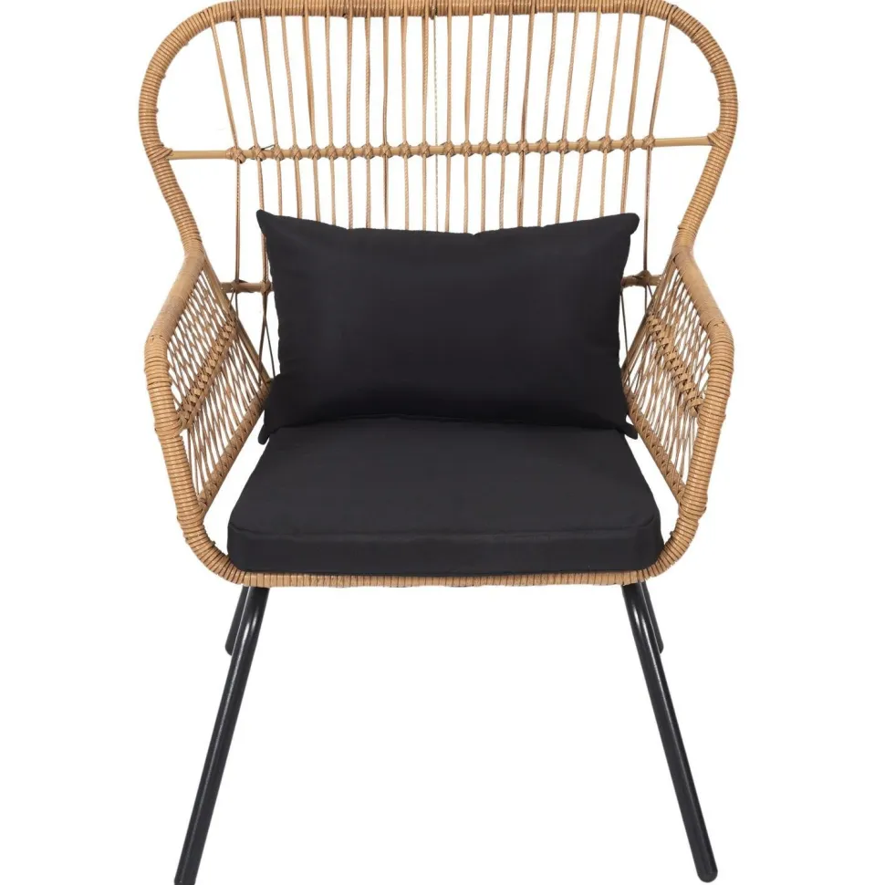 Krzesło z podłokietnikami SurabayaArm to odpowiedź na cieszącą się dużym zainteresowaniem linie Surabaya. To niezwykła kolekcja, która stała się nieodłącznym elementem słonecznych dni. Odpoczynek na Twoim balkonie, tarasie lub w ogrodzie może stać się jeszcze przyjemniejszy. Wykonaniez trwałego, techno rattanusprawi, że krzesło wniesie do przestrzeni świeżej atmosfery nawiązującej dostylu boho,utożsamianego z wygodą, latem oraz wakacyjnym luzem. Dodatkowy komfort podczas odpoczynku zapewnią poduszki obite czarną tkaniną – na siedzisku i oparciu.