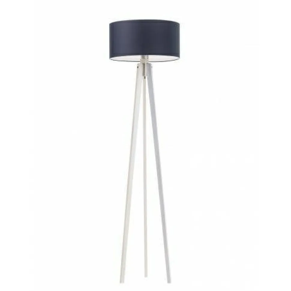 Lampa podłogowa Miami wyróżnia się ciekawą konstrukcją, tworzoną przez trzy drewniane nogi i tkaninowy abażur, Wzrok przykuwa drewniana podstawa oraz konstrukcja przypominająca budową statyw aparatu fotograficznego, Design lampy w udany sposób żongluje koncepcjami – z jednej strony klasyczny abażur, z drugiej nowoczesny kształt,WYMIARY ABAŻURU:wysokość – 20 cm, szerokość – 40 cmWYMIARY LAMPY:wysokość – 148 cm, szerokość – 40 cmKOLOR ABAŻURU: granatowyKOLOR STELAŻA: białyMATERIAŁ:stelaż – elementy drewniane, abażur – holenderska tkanina tekstylna podklejona na folii PVC
