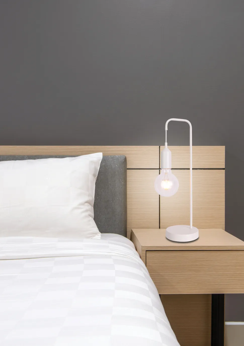 Seria nowoczensych lamp, inspirowanych stylem industrialnym, wykonanych z metalu w czterech wariantach kolorystycznych: czarnym, białym, szary i czerwonym. Rodzina doskonale nadaje się do pomieszczeń takich jak: salon, gabinet, sypialnia, pokół dziecięcy, pokój młodzieżowy. Prostota i surowa stylistyka lamp sprawiają, że rodzina będzie doskonale wyglądała zarówno we wnętrzach industrialnych, jak i w innych nowoczesnych aranżacjach. Lampa stołowa w kolorze białym z jednym źródłem światła. Żarówka nie jest dołączona do produktów z zewnętrznym źródłem światła.