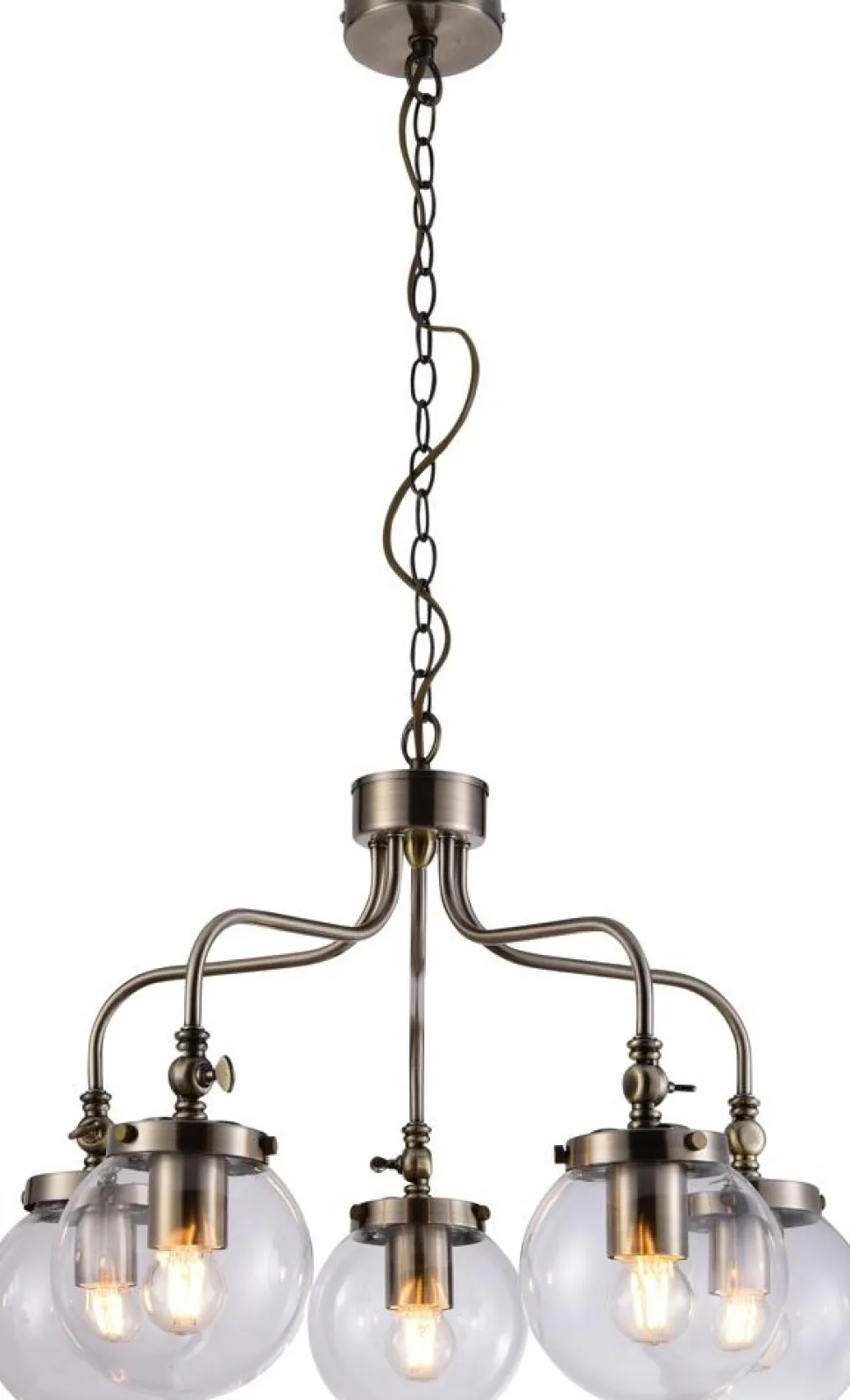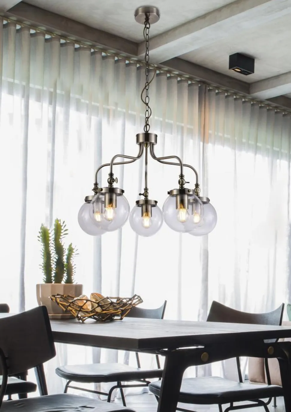 Lampa wisząca Ballet 5x40W E27 patynowy wykonana jest z wysokiej jakości materiałów, takich jak szkło i stal, co gwarantuje jej długą żywotność i odporność na uszkodzenia. Bezbarwne szklane klosze są odporne na zarysowania, a stalowa konstrukcja zapewnia stabilność i solidność lampy.