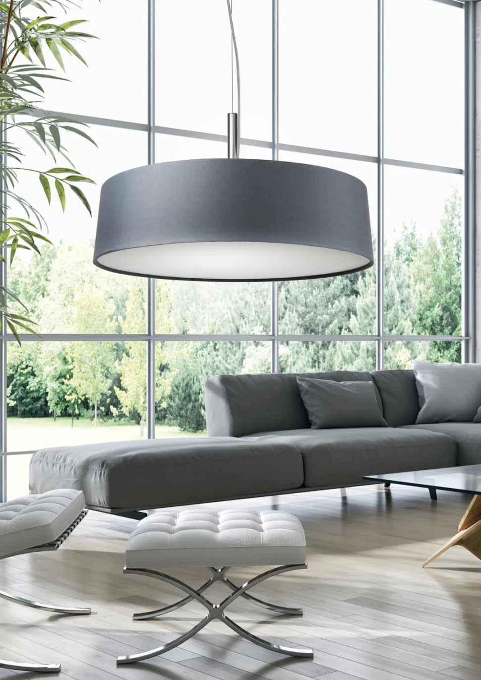 nowoczesny i niezwykle funkcjonalny zwis abażurowy; abażur wykonany z jednobarwnej tkaniny, wzmocniony od wewnątrz PCV, od dołu estetycznie osłonięty maskownicą; całość zawieszona na ekskluzywnym zawiesiu z chromowaną podsufitką i ozdobną rurką nad abażurem; możliwość dostosowania wysokości; dostępny w 3 kolorach
